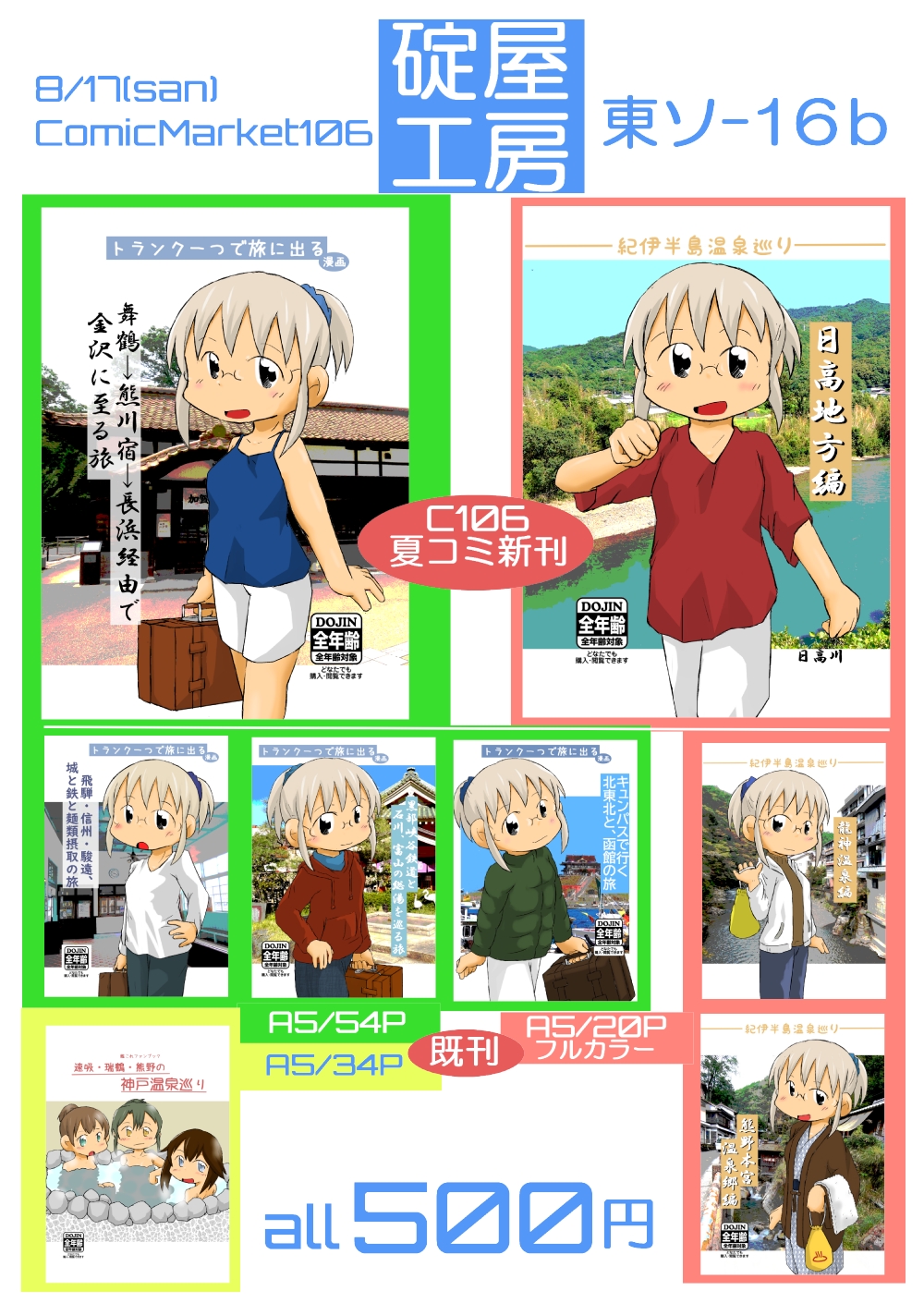 他、既刊として、準新刊となる「トランク一つで旅にでるキュンパスで行く北東北と、函館の旅」と艦これ本でもある「速吸・瑞鶴・熊野の神戸温泉巡り」(関東方面初頒布)、温泉本の「紀伊半島温泉巡り 本宮温泉郷編」「紀伊半島温泉巡り 龍神温泉編」、そして昨年の冬夏コミケ発行の「トランク一つで旅に出る 黒部峡谷鉄道と石川、富山の総湯を巡る旅」「トランク一つで旅に旅にでる 飛騨・信州・駿遠、城と鉄と麺類摂取の旅」を頒布する予定です