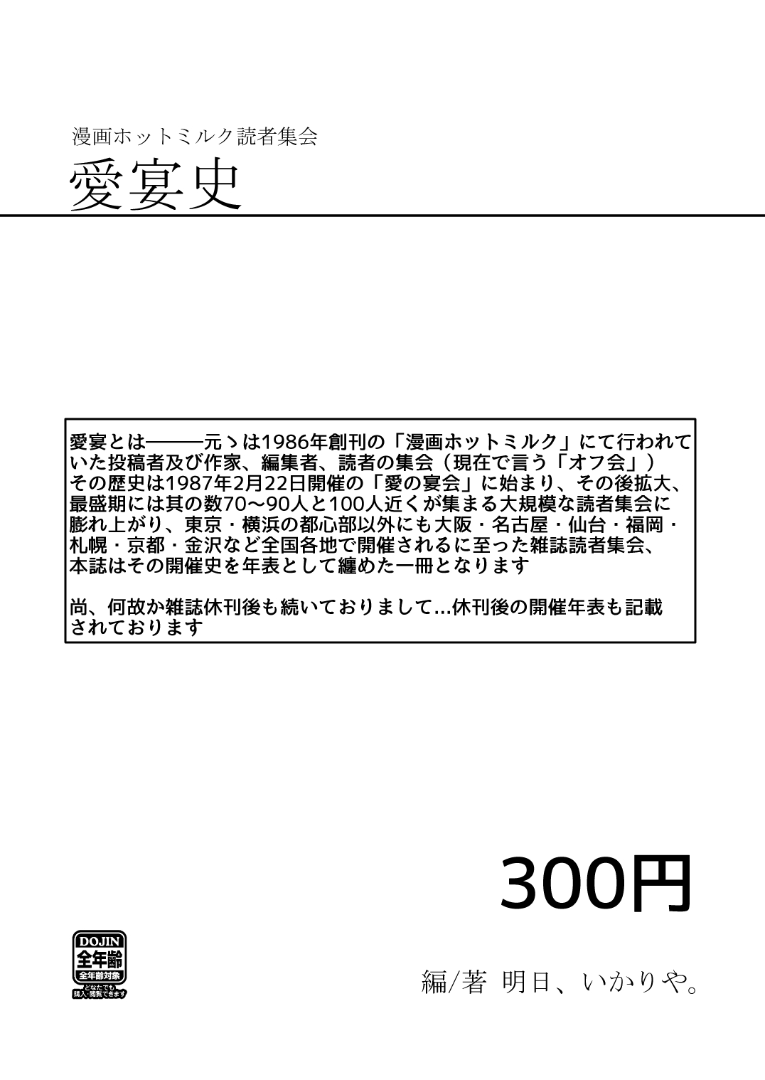 1986年から2001年まで白夜書房→コアマガジンで刊行されていた「漫画ホットミルク」の読者集会「愛宴」の開催年表を纏めた一冊です。需要とか全く判りませんが、取り合えず物理化したかったので作りました。後、主に需要が有りそうな人は多分老眼なので判型と文字は大きくしましたw