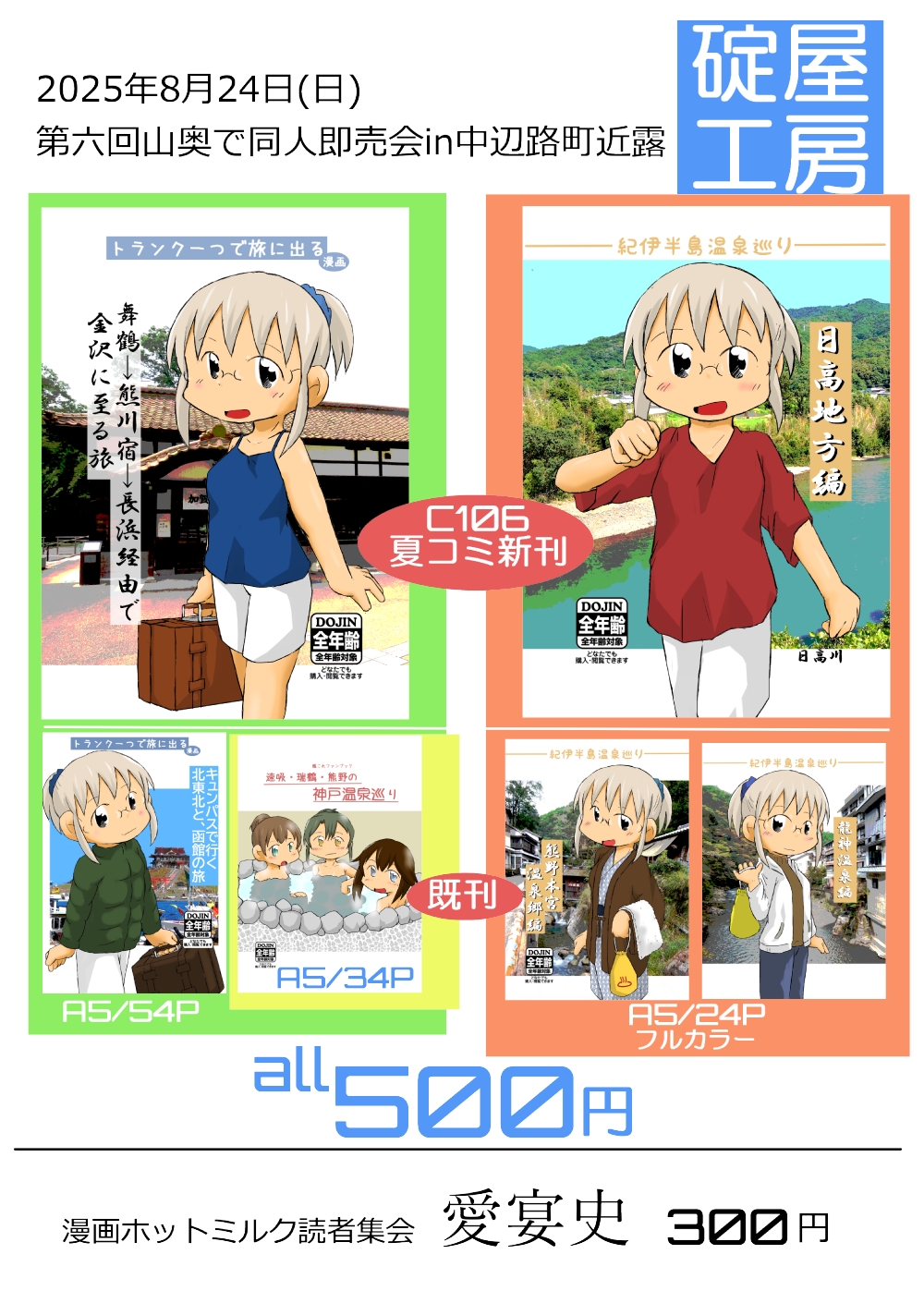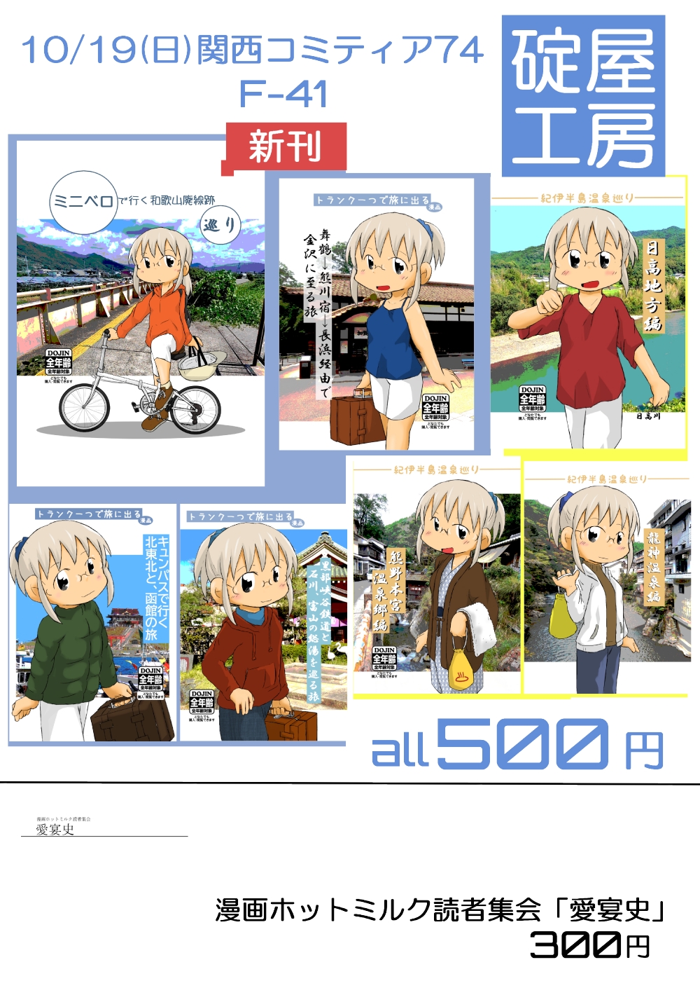 新刊は「トランク一つで旅にでる 舞鶴→熊川宿→長浜経由で金沢に至る旅」(A5/54P/500円)と「紀伊半島温泉巡り 日高地方編」(A5/24P/フルカラー/500円)、「漫画ホットミルク読者集会愛宴史」(B5/28P/300円)になります。