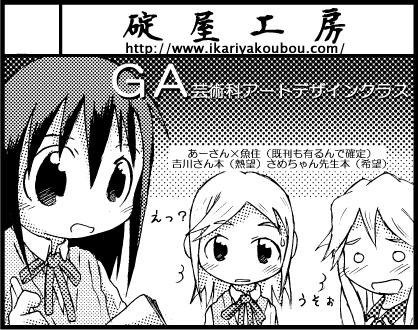 新刊は「GA芸術科アートデザインクラス」のあーさん×魚住本と「朝霧の巫女」尋×柚子っち本です(詳しくは同人情報で)。あと明後日ちゃんと机の上に並ぶか如何かは鳥さん次第で。