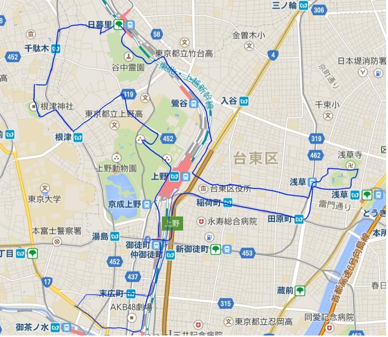 一先ず、かっぱ筋通りを突き抜けて上野駅の脇に出て、そのままラブホ街-鶯谷-ラブホ街を突き抜ける。根岸にある歩道者専用の高架を超えて、谷中霊園へ入り、谷中公園も突っ切って、谷中銀座入口までたどり着く。谷中銀座を冷かしつつ抜ける辺りで、やや雲行きが怪しくなるが、