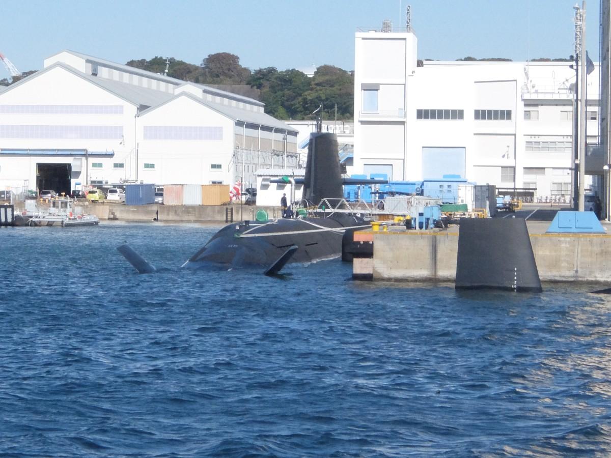 まずは横須賀本港を出発。一番近くにあるのが潜水艦ですが、艦名は分からず。艦尾からして「ずいりゅう」か「こくりゅう」の何れかかと。