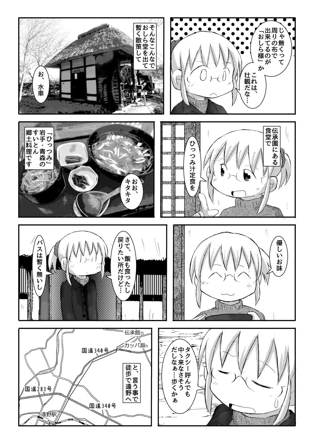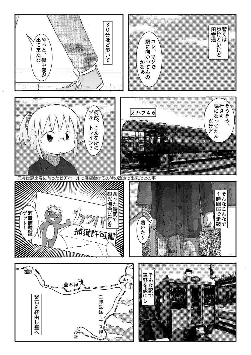 おしら堂参拝後、伝承園の食堂で「ひっつみ汁」定食を頂き、その後は徒歩で1時間弱かけて遠野駅へ。カッパ捕獲許可証をゲットし釜石経由で盛へ