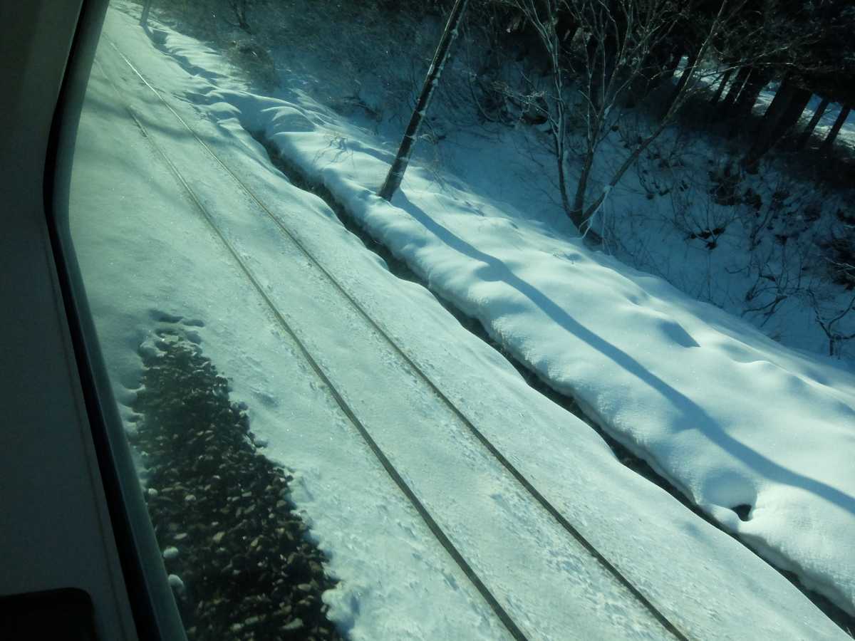 土樽駅の手前、線路を見ると見事なまでに雪が無いのが線路部分だけで、そりゃ確認もするわなと納得でした