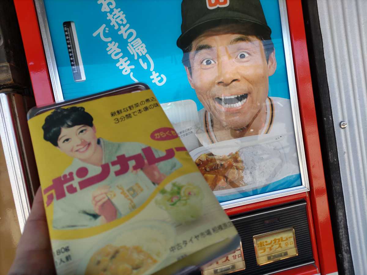 まずは当日が金曜日だった事もあってコレですよ、ボンカレー自販機でカレー。7年半前の「コインスナック御所24」以来。御所24のカレー自販機もそろそろ劣化で厳しいらしい事を考えると最後の砦です