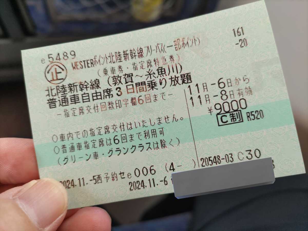 これです。WESTERポイント使用の北陸新幹線乗り放題きっぷ。丁度来年3月末で失効するポイントが600以上有ったので300ポイント+9000円で使わせて貰って北陸を巡ろうという算段でした
