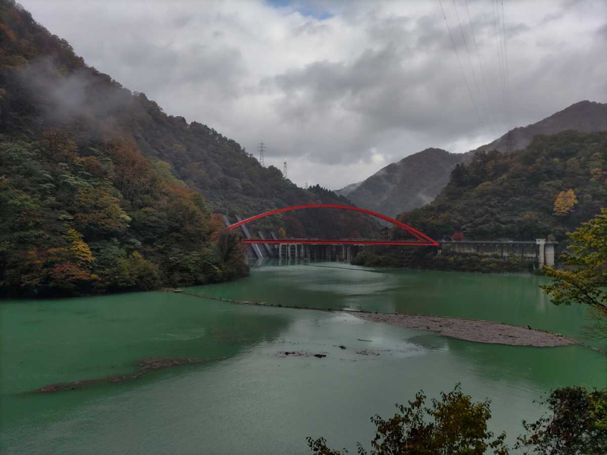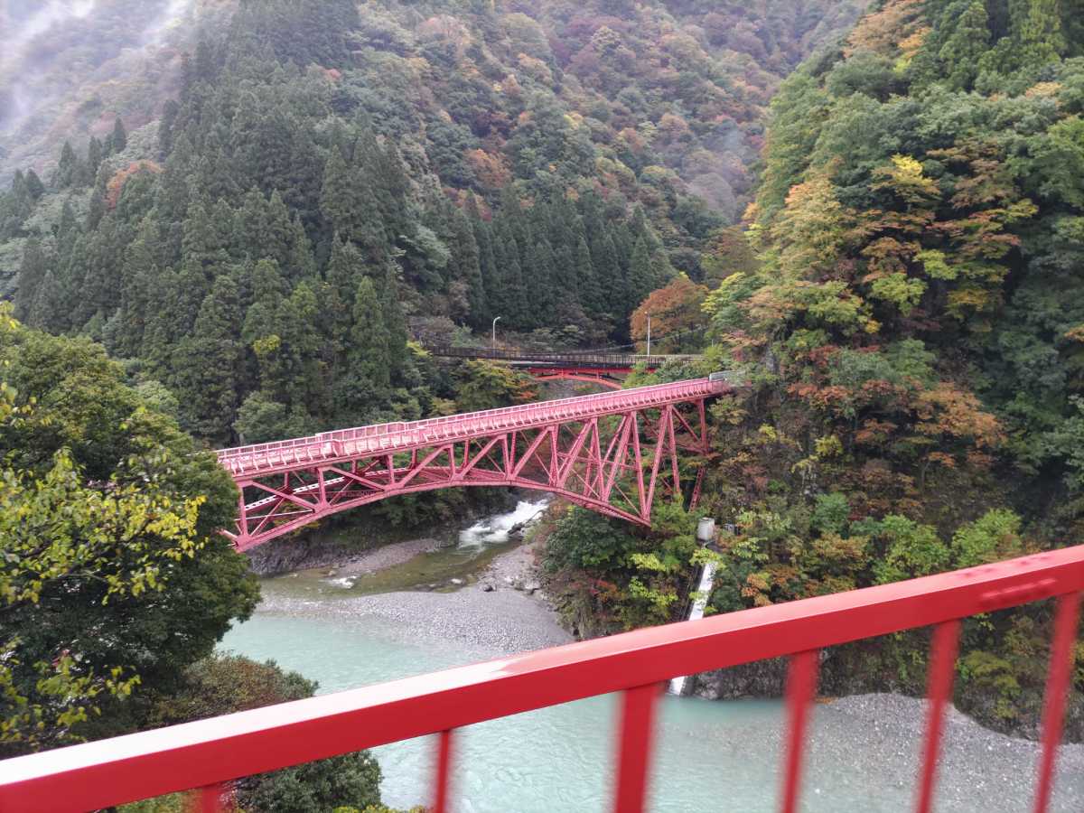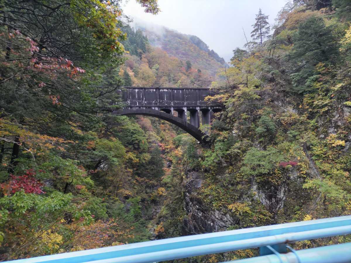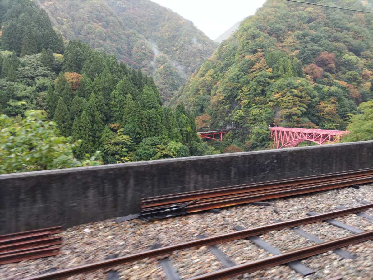 一寸小雨の降る中で両サイドオープンのトロッコに乗車し、気温6度の中、宇奈月駅を出発します。出発してすぐに新山彦橋を通過するのですが、