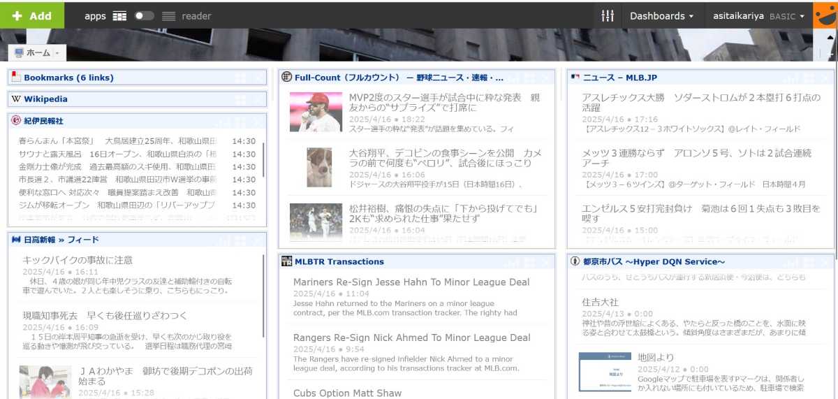 とりあえず、こんな感じに(;’∀’) 地元のニュースとMLB情報がメイン(真ん中に有る英語表記はMLBのtransaction)ですね