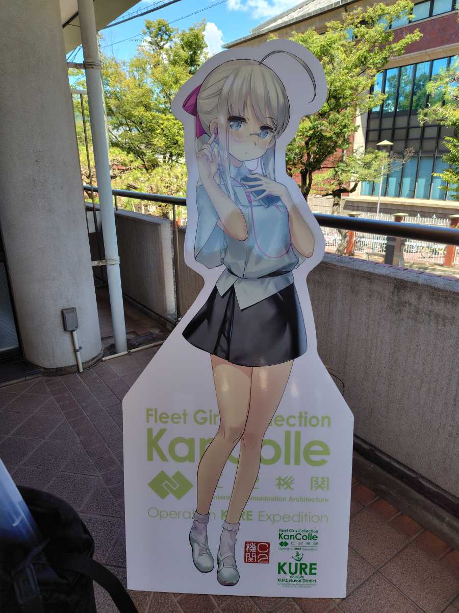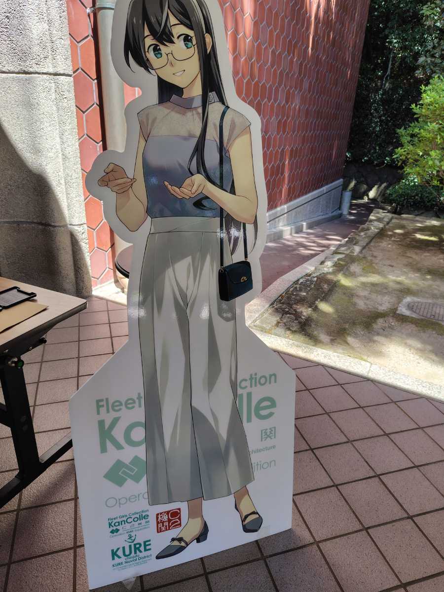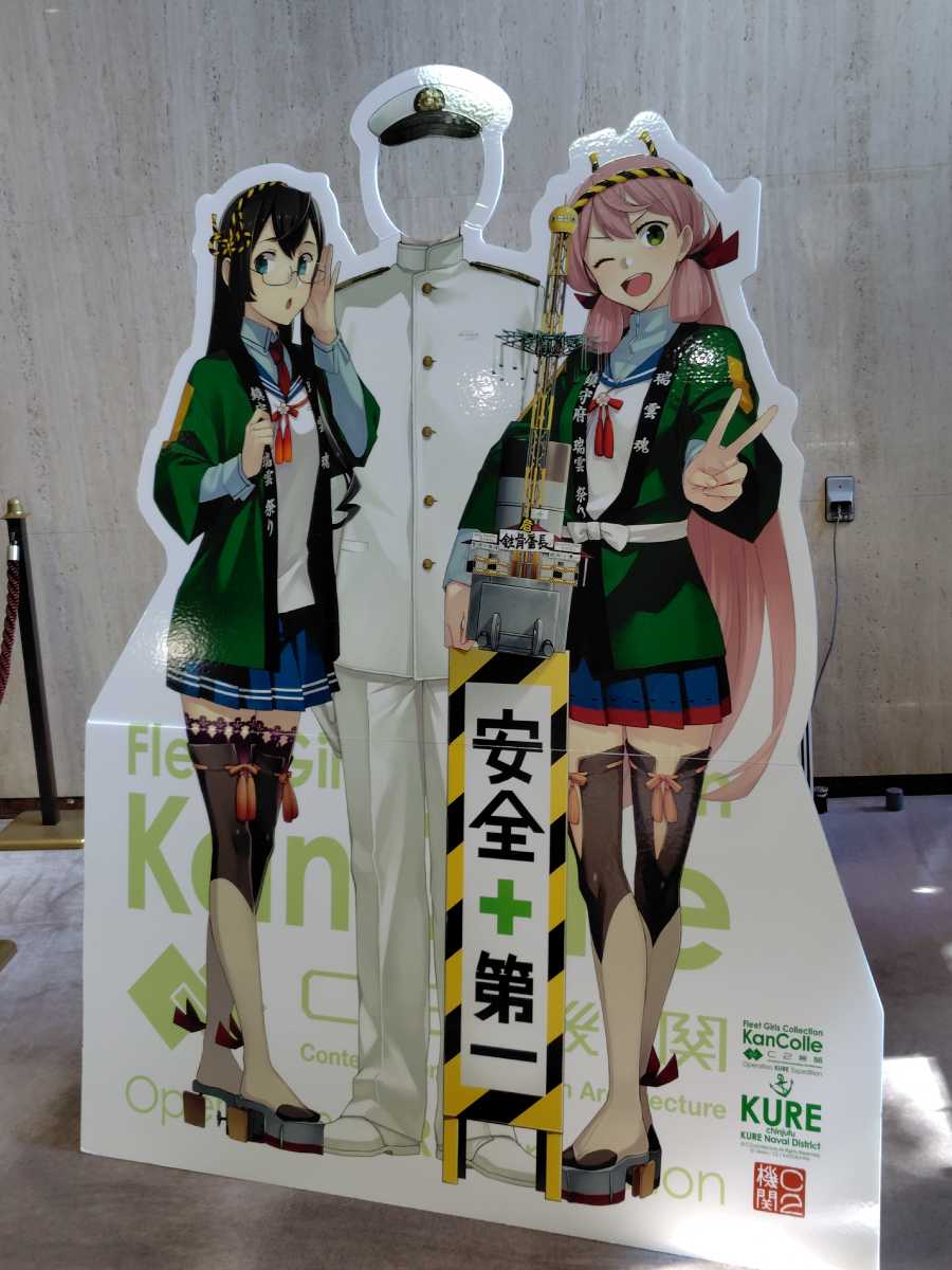 会場内は撮影禁止に付き、撮影できる明石さんと大淀さんとの顔ハメパネルでも。内容はこれまでの原画や設定ラフ、呉竣工の艦娘の戦歴をビジュアル化した映像と更にサーカスや舞台の衣装など。見ごたえは十分でした。個人的には藤川氏が夕雲型の設定ラフ画が良かったなぁ、と。朝霜が布団抱き枕にして寝てるラフ描きが滅茶可愛かったです。後、衣装が一点「出撃中」になってたのも面白かったw