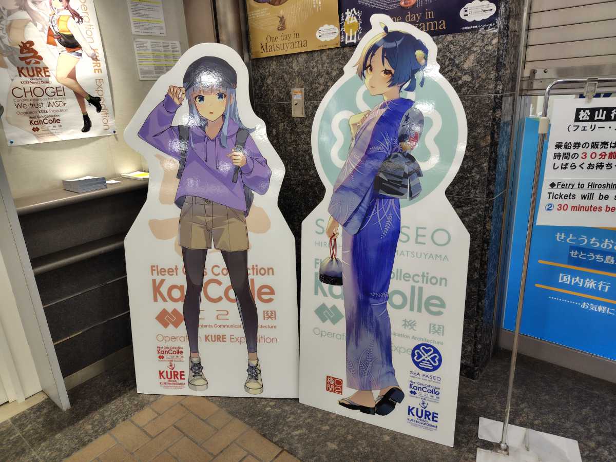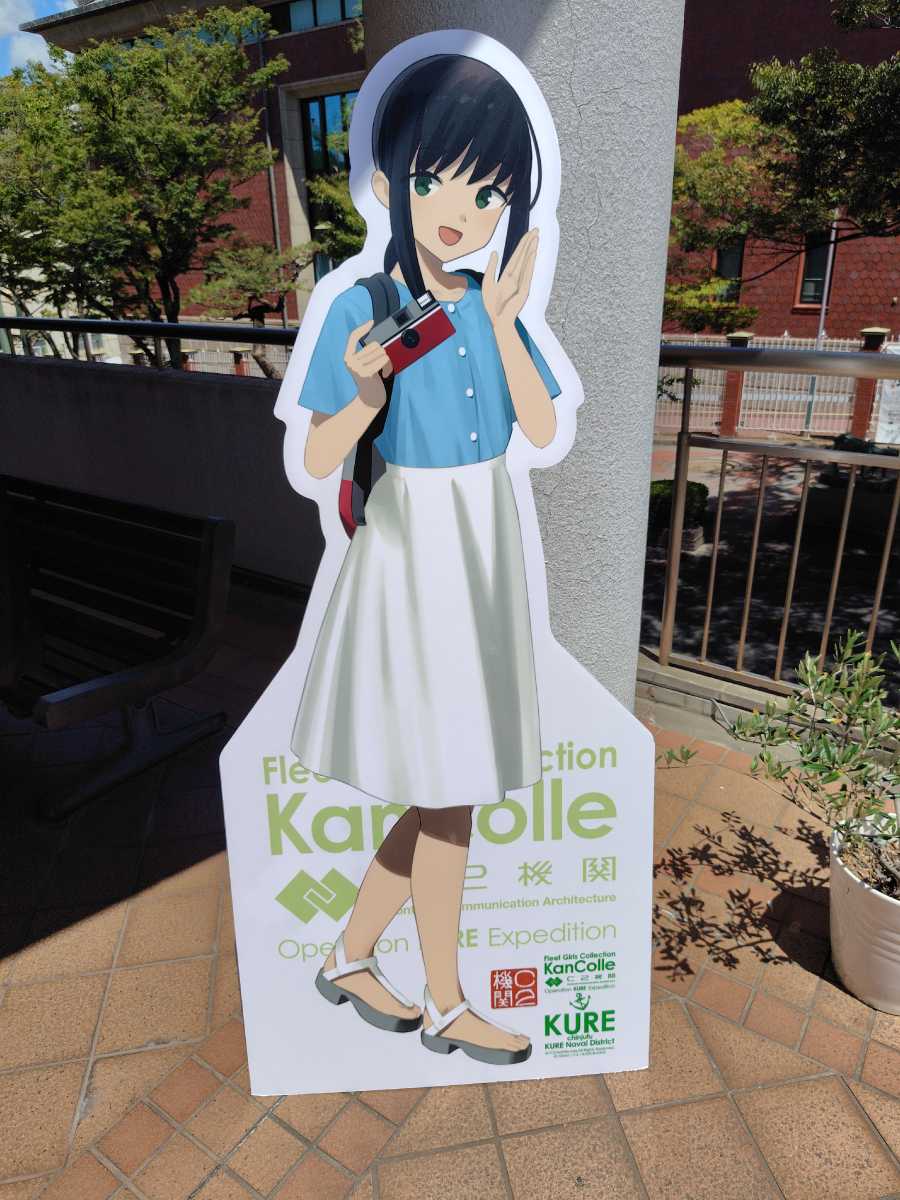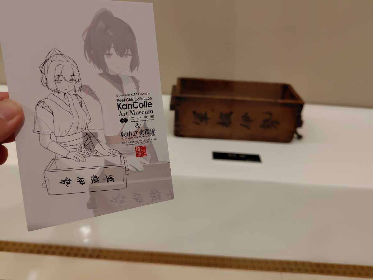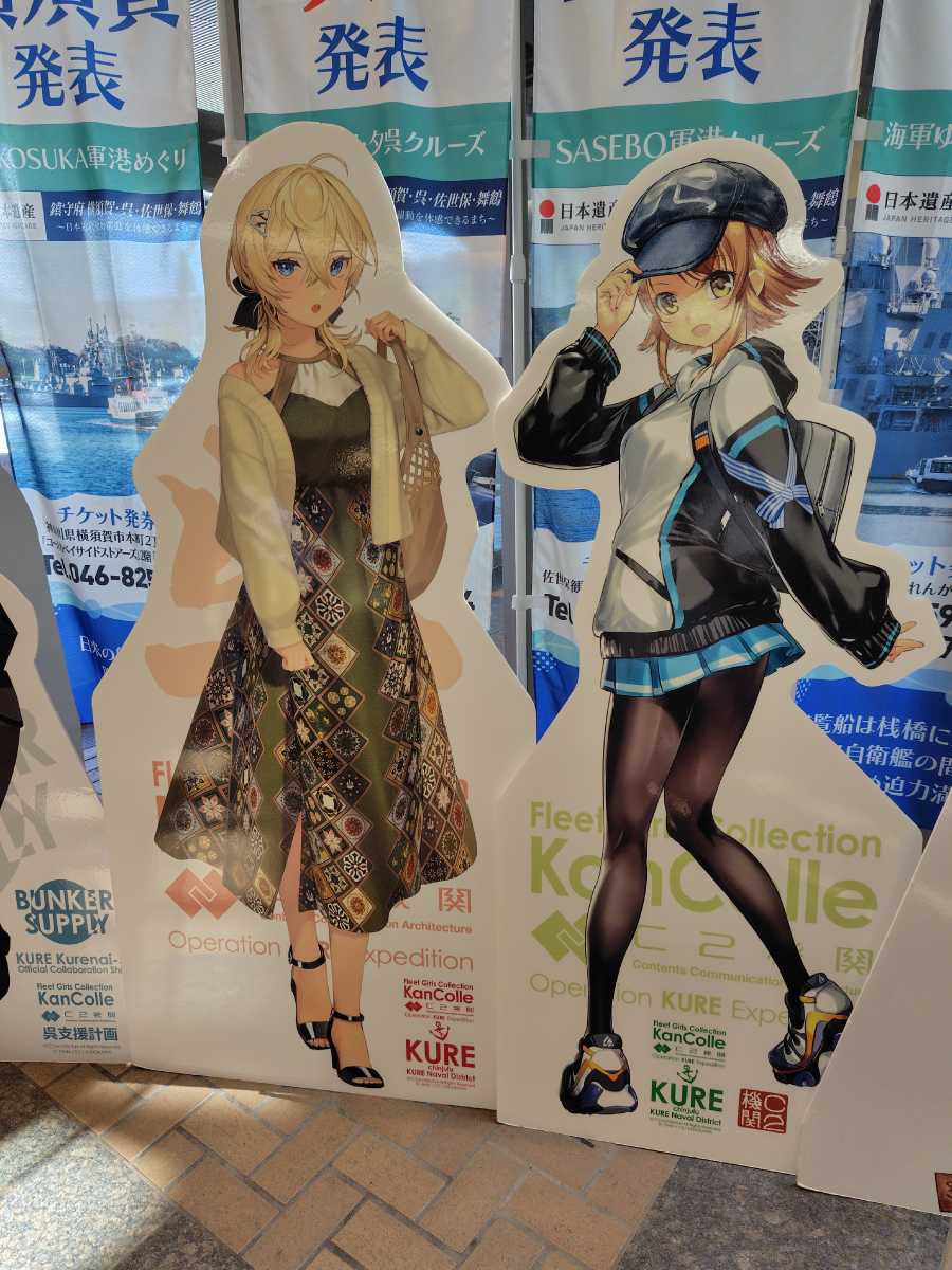 会場内は撮影禁止に付き、撮影できる明石さんと大淀さんとの顔ハメパネルでも。内容はこれまでの原画や設定ラフ、呉竣工の艦娘の戦歴をビジュアル化した映像と更にサーカスや舞台の衣装など。見ごたえは十分でした。個人的には藤川氏が夕雲型の設定ラフ画が良かったなぁ、と。朝霜が布団抱き枕にして寝てるラフ描きが滅茶可愛かったです。後、衣装が一点「出撃中」になってたのも面白かったw