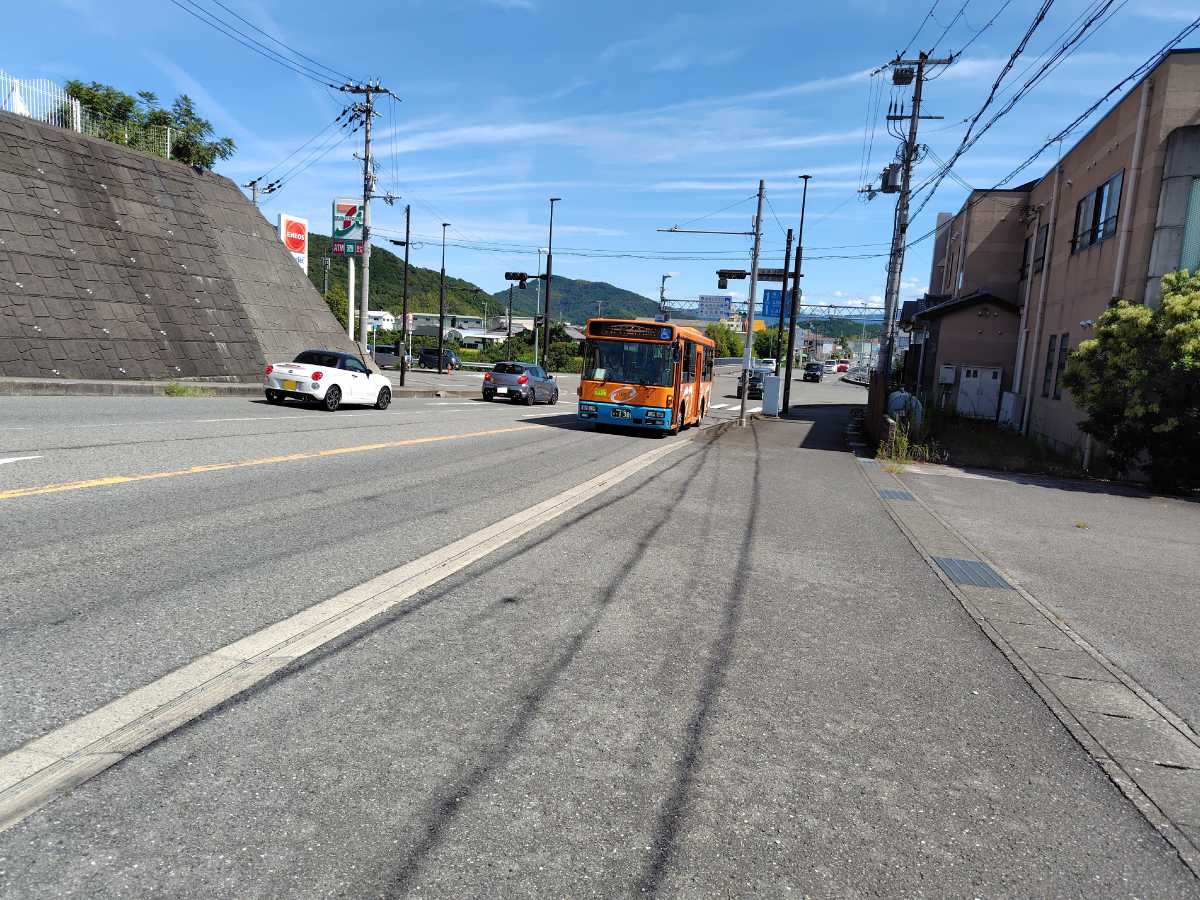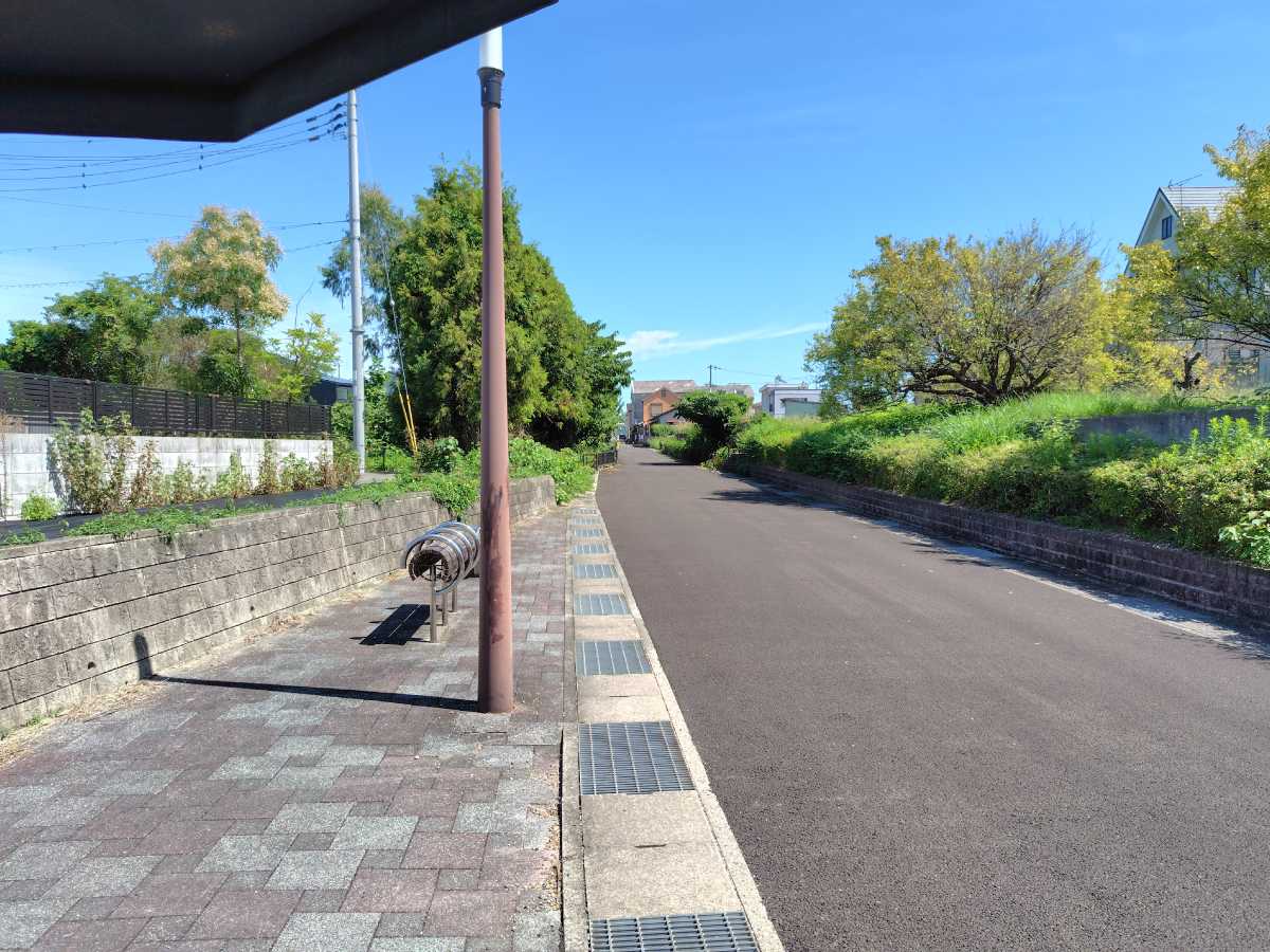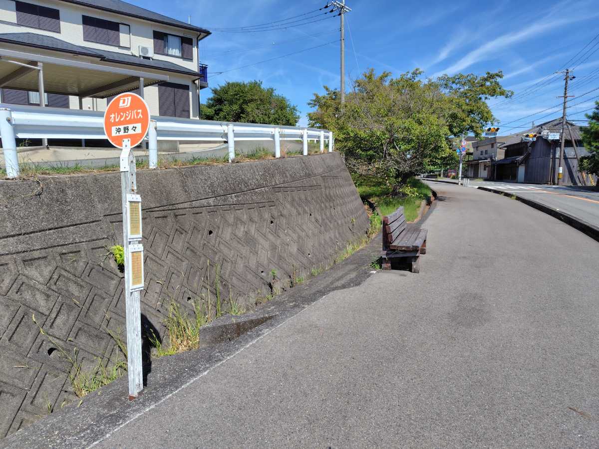 大十バスの沖野々バス停へ。この辺りが嘗ての沖野々駅周辺となるが道路拡幅工事の影響で痕跡を見る事は難しい