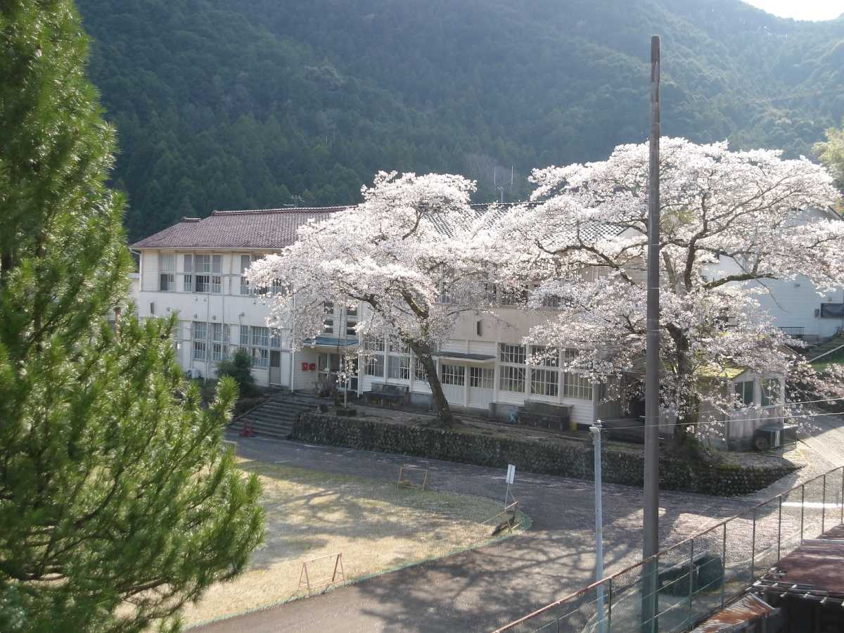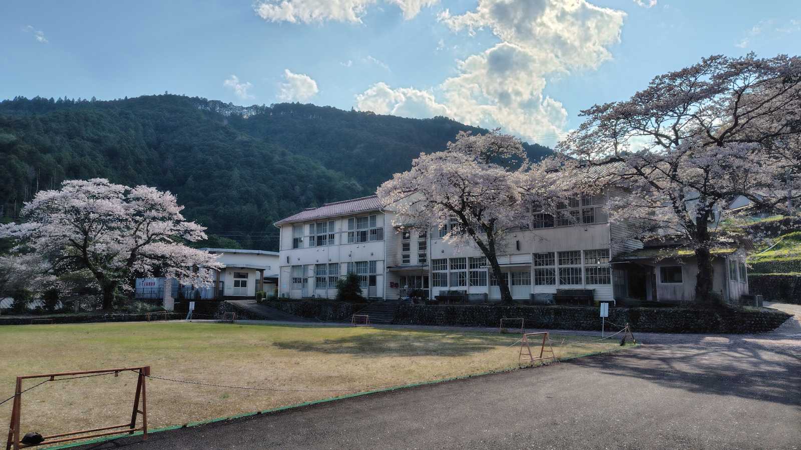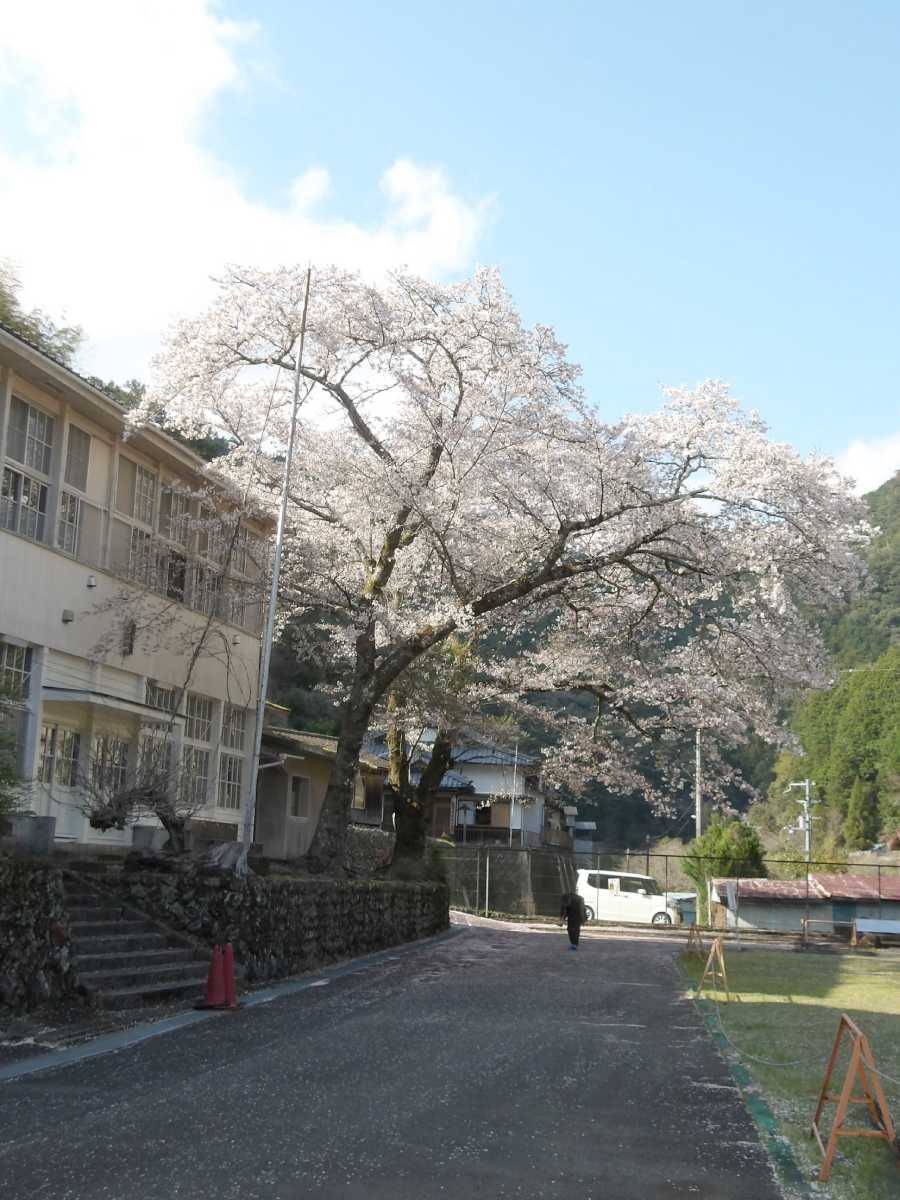 四村川沿いの桜の次は、旧皆地小学校跡。現在は「皆地いきものふれあいの里」として利用されています。尚、下に有るスペースは前の染色工房の駐車場なので、車は校庭まで上げてしまいましょう(端に止めればOK)