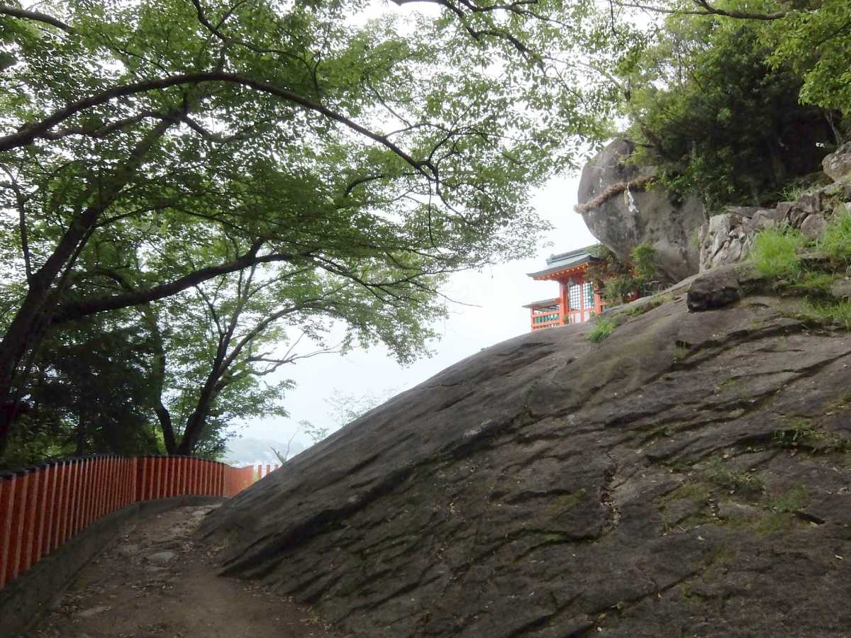 本殿とコトビキ岩。コトビキ岩の威容が目立ちます。
