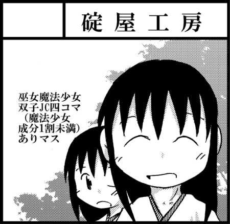「碇屋工房」で参加致します。8pの無料小冊子「魔法少女えんび~なえんび~のP5」が初配布になります。既刊である本編「魔法少女えんび~なえんび~の」の1~2巻も置いて居りますので、ご興味の有る方はお立ち寄り頂ければ幸いです。