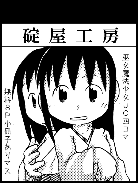 明日、神戸国際展示場で行われます「そうさく畑FINAL」。表題通り4丁目30番地「碇屋工房」で参加致します。既刊であります「魔法少女えんび~なえんび~の」の1~2巻と、あと春以降だした無料4コマペーパーも持って行く予定ですのでー。