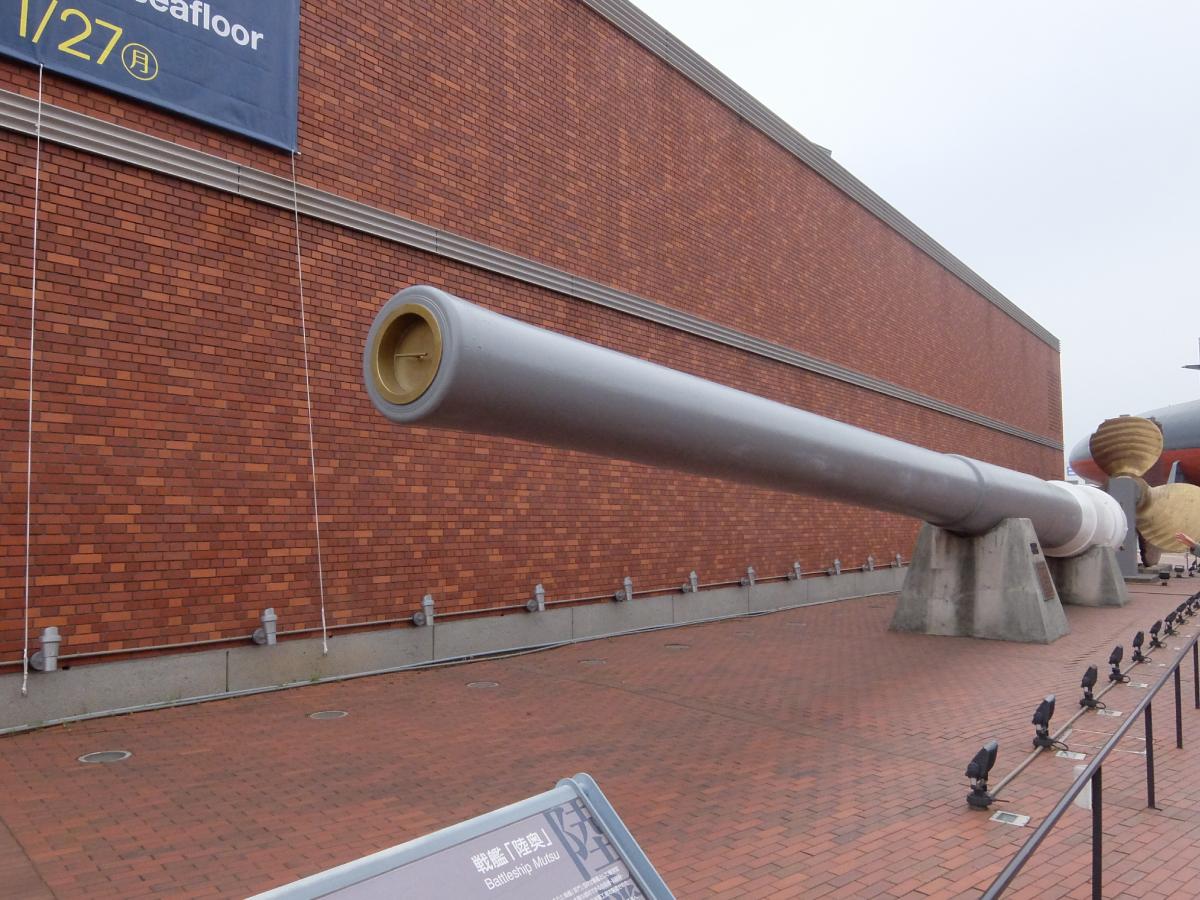 戦艦陸奥の41センチ砲がお出迎えです。