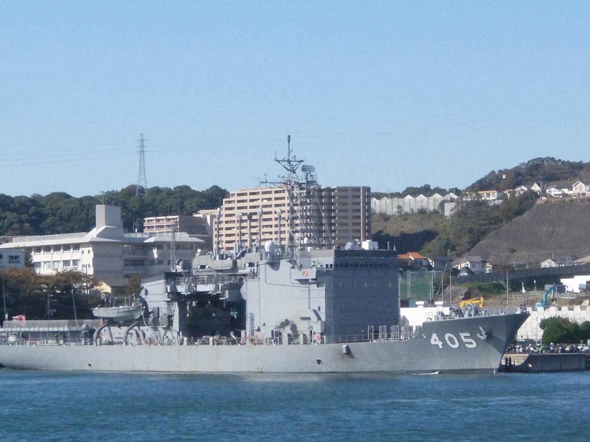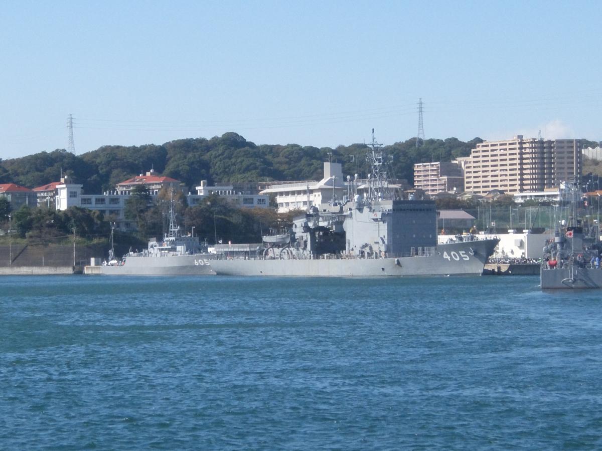 「ちよだ」の奥には掃海艇の「ちちじま」。船体は「はちじょう」と違ってFRP製です。