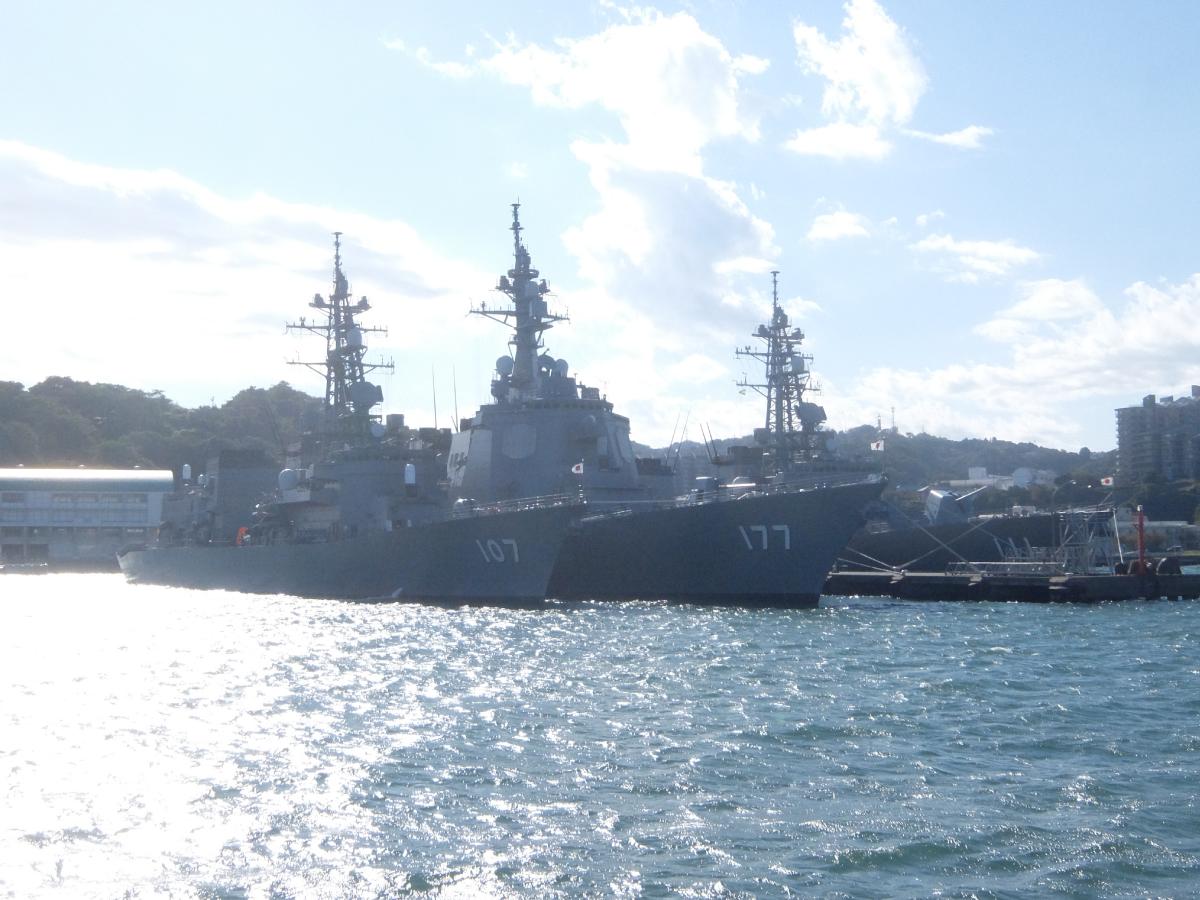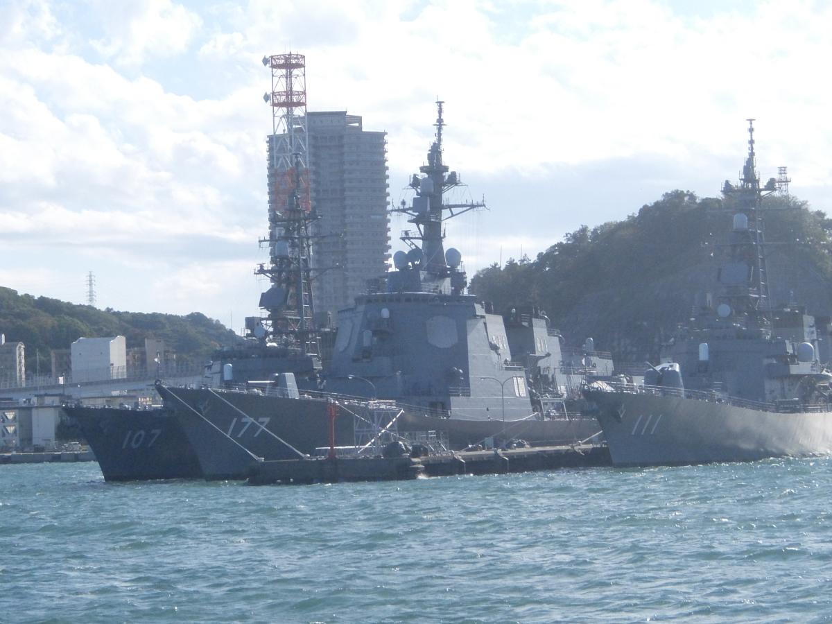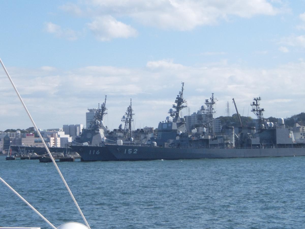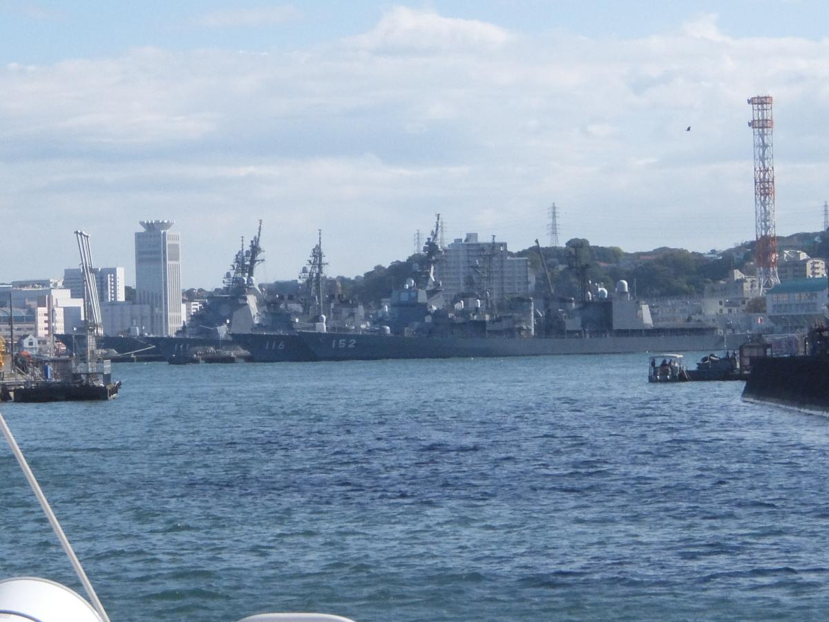 そんでもって乗船して居る遊覧船は新井掘割を進んでいきます。前には本港に停泊する護衛艦群。
