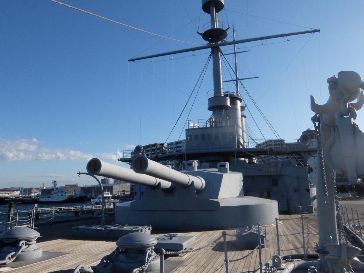 甲板にでて前方から主砲の30.5センチ連装砲(レプリカ)と艦橋。