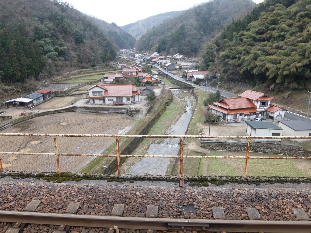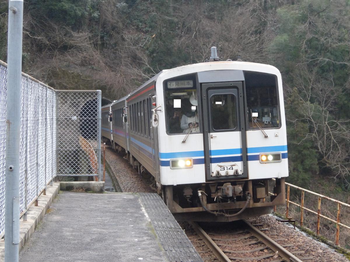 上から見ると絶景です。宇都井到着が大体10時30分過ぎ。11時09分着の石見川本行の入線が見れるので、見届けます。