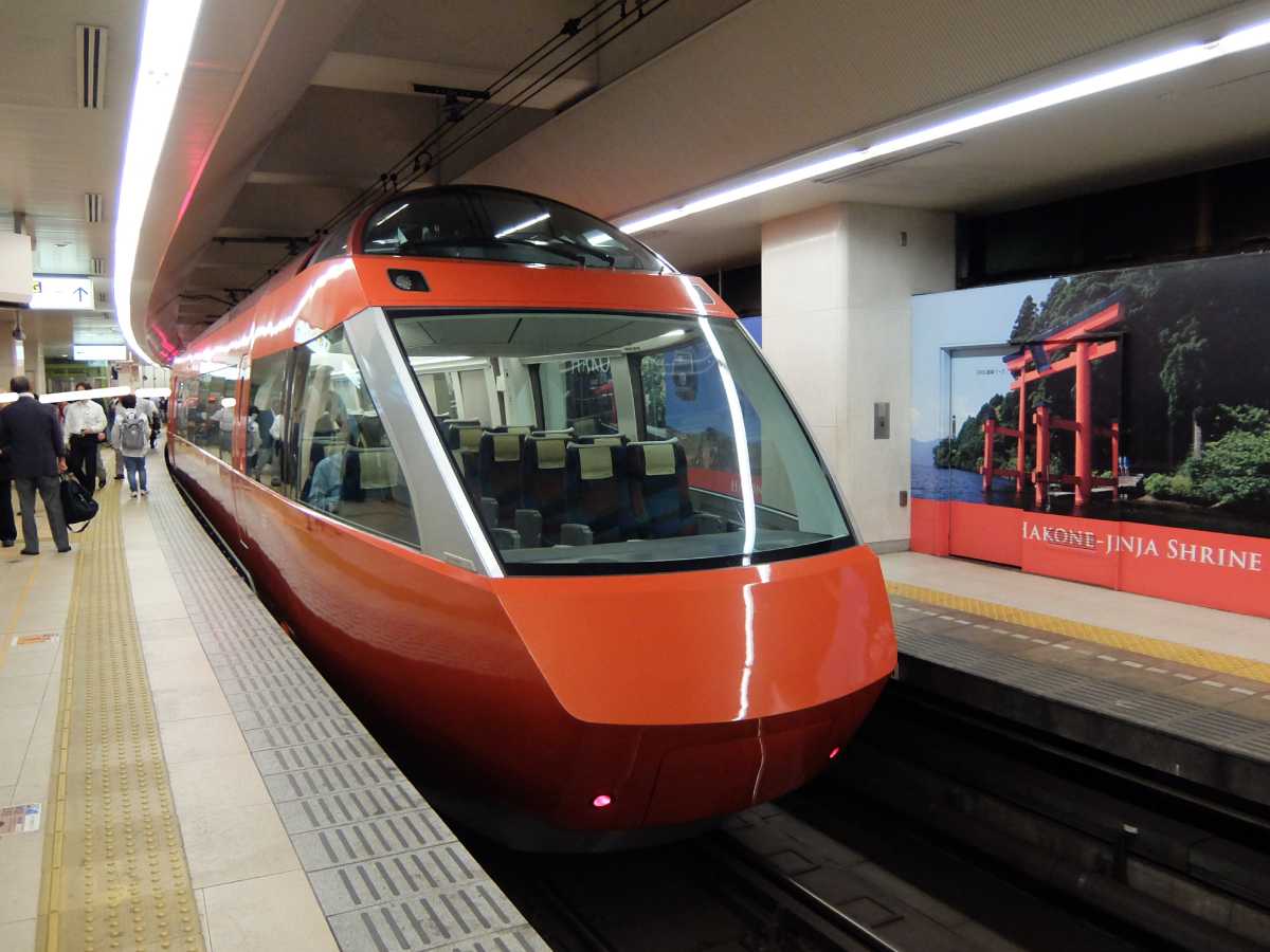 これに乗る為でした。小田急の新型ロマンスカー車両「GSE(70000形)」。流石に被り付きではないが先頭車両の座席を取って頂いた事も有って、眺めは上々。よく、鉄道旅でも空いてると先頭車両から前を見る事はあるけど、やっぱり迫力が違う。
