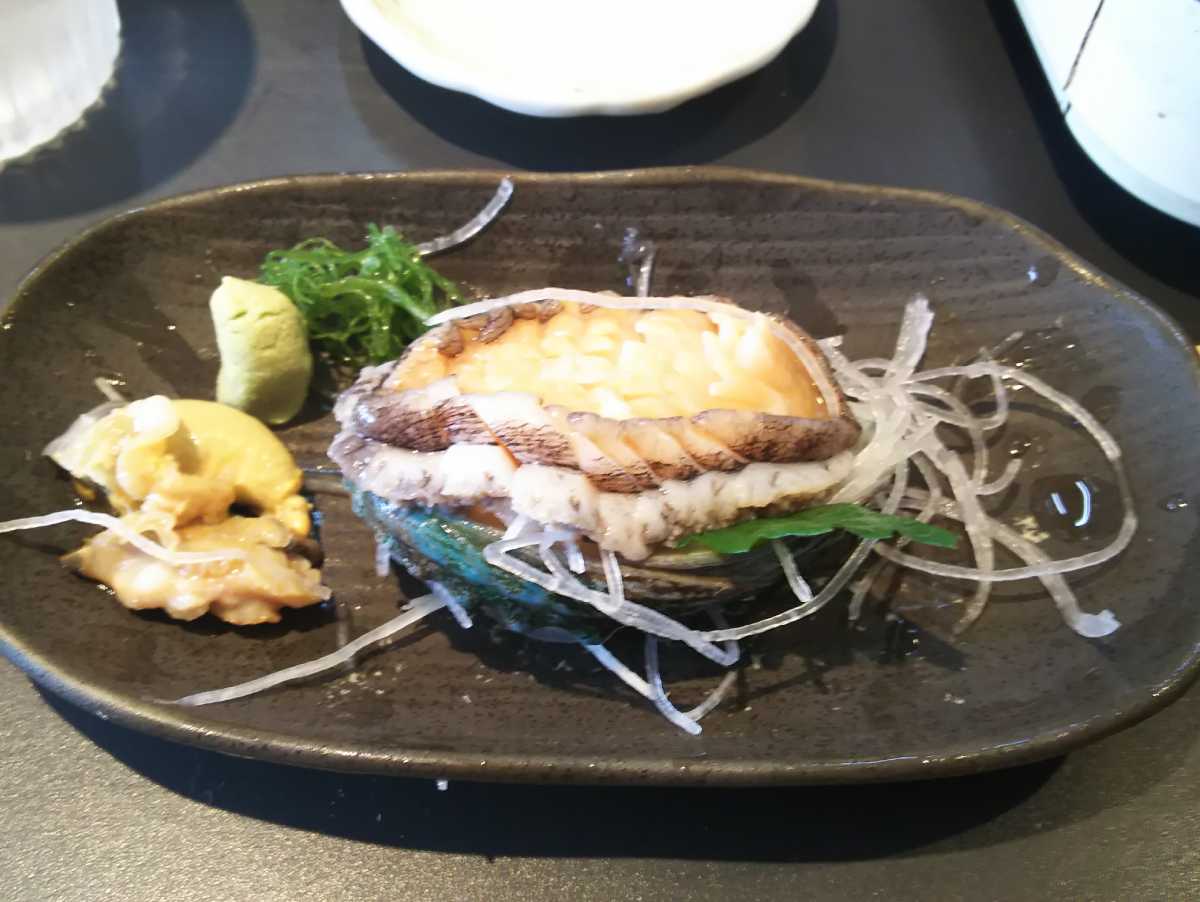 其の2 アワビ(1400円以上なら+500円で追加できる)。アワビ500円なら喰わなきゃ損。こりこりで旨い。