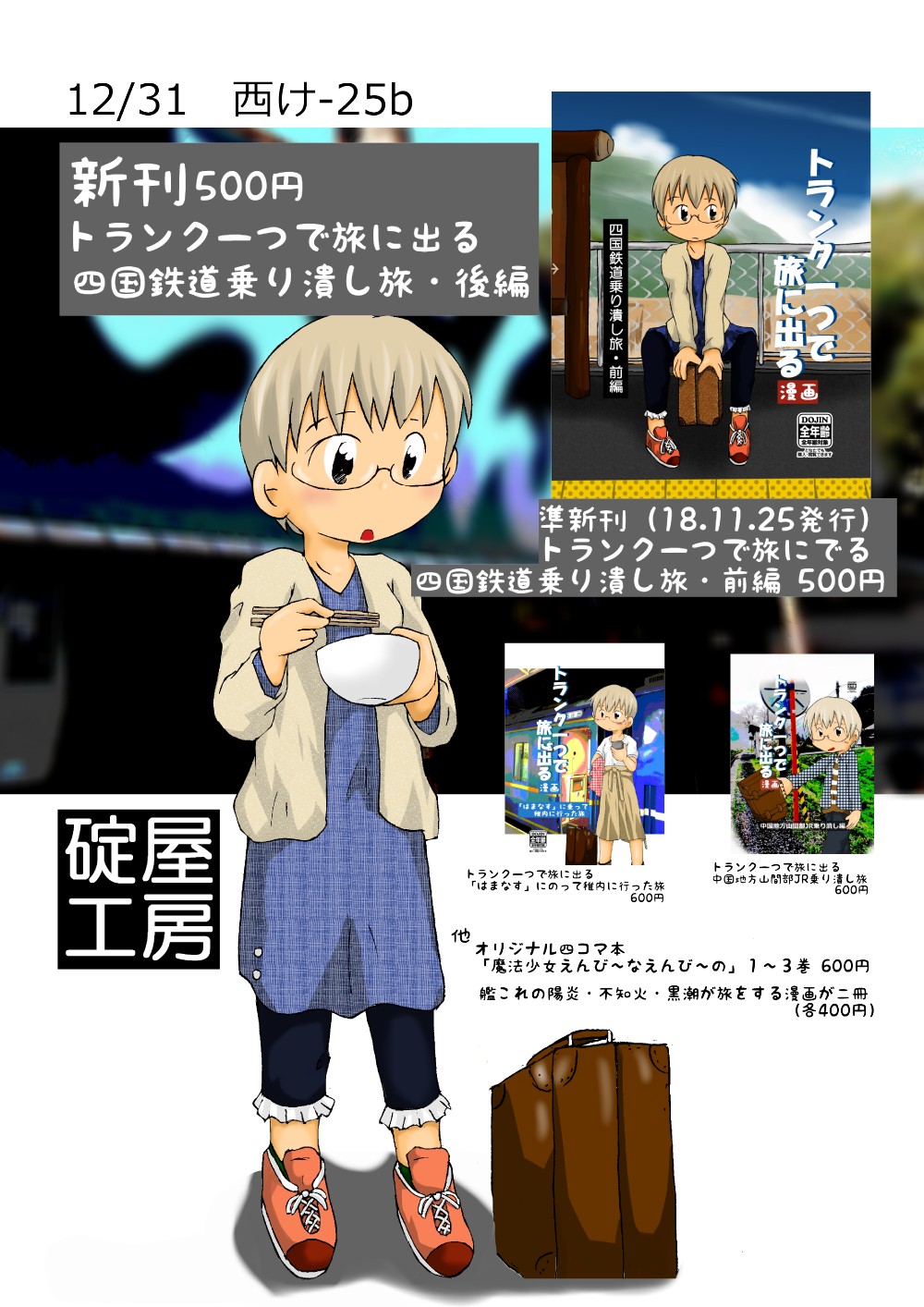 11月のコミティア126で領布した「四国鉄道乗り潰し旅・前編」に加え「「はまなす」に乗って稚内に行った旅」「中国地方山間部JR乗り潰し旅」(共にA5・66ページ・600円)他、オリジナル四コマ「魔法少女えんび~なえんび~の」1~3巻(A5・600円)に、艦これの陽炎不知火黒潮がイベントいったり旅したりする「佐世保鎮守府巡りの旅」「白浜に生「かげろう」を食べに行く旅」(A5・400円)と言った既刊も持っていきますので、何卒宜しくお願い致します。