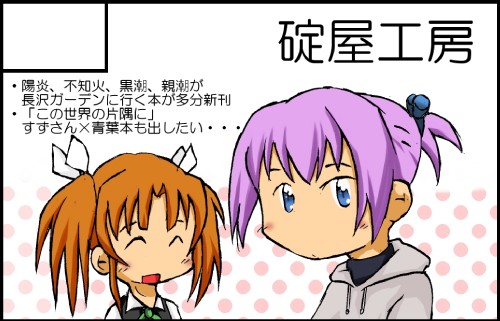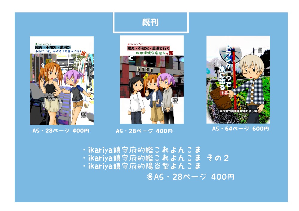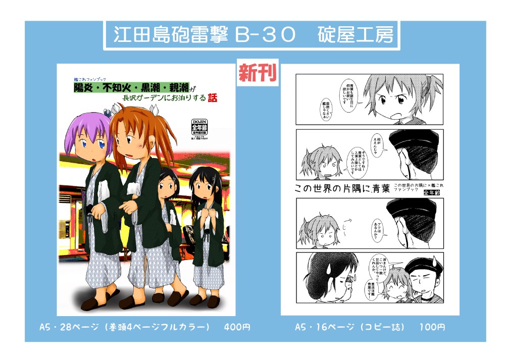 明日の砲雷撃戦! よ~い! 江田島SPは B-30「碇屋工房」でお待ちしております。 新刊は二種類で。 ほか既刊も持って参りますので宜しくお願い致します。当日はイベント迄には雨が上がる予報。如何にかこの予報が当たってくれればなと、切に願います。 あ、あと、一寸「飲み物」持っていきますノデ、もしご興味ある方は覗いてみてくださいな。昨秋のリアル秋刀魚祭りでも出た一品なんですが…ね。いかりやが持っていく「飲み物」で察しが付く人は付くかも(;’∀’) 投稿者: ikariya 明日、いかりや。 93~03年まで成人向け漫画雑誌「漫画ホットミルク」「漫画ばんがいち」「コミックメガキューブ」の読者コーナーに投稿していた元・ハガキ投稿者。漫画ホットミルク読者集会「愛宴」の幹事も長らく務めておりました…...まだ「おります」かもしれません。同人活動も碇屋工房にて97年~現在まで続いております。好きなものに関してはこちら参照で。 ikariya のすべての投稿を表示