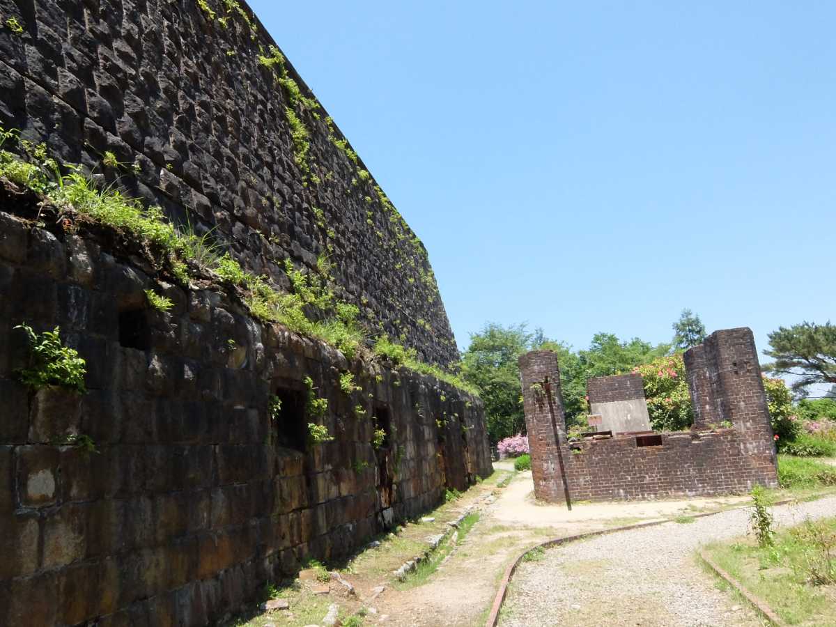 上の方がらホームに降りてくる階段なんかも残っておりました(上に見えるレンガの建物は旧・採鉱本部)。