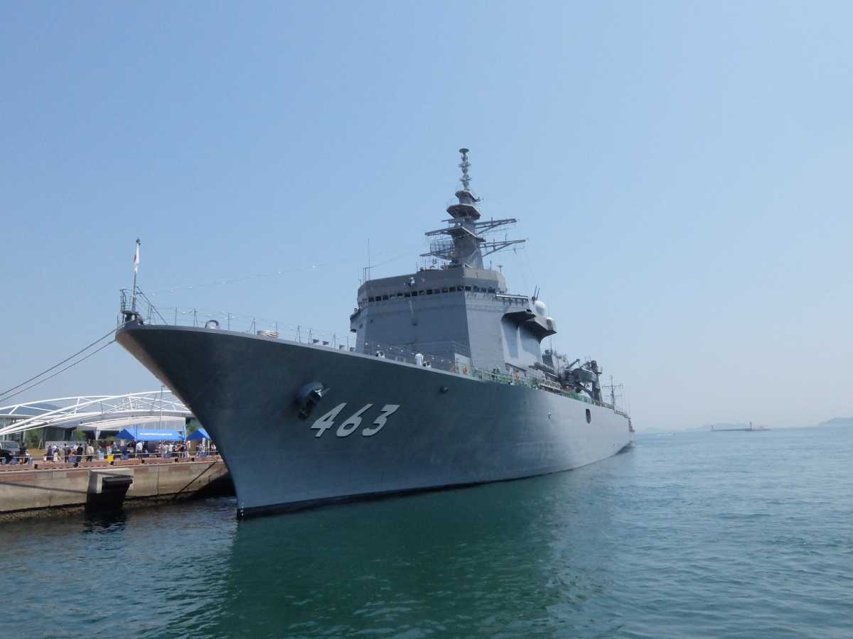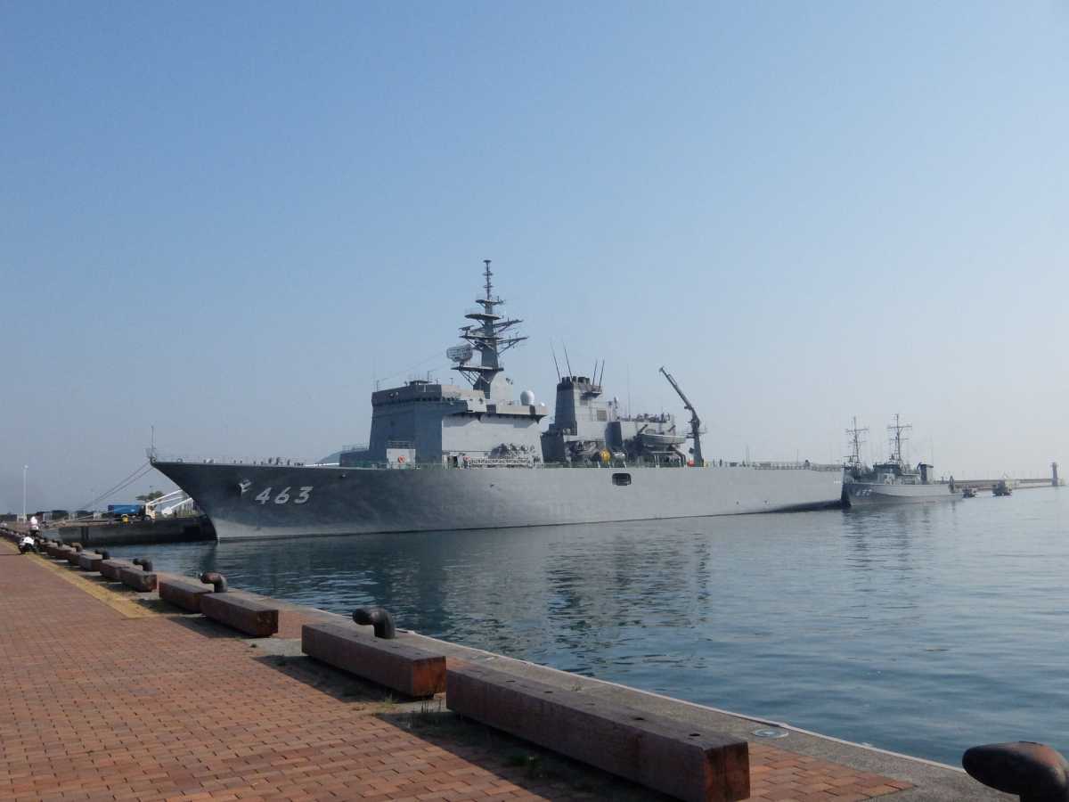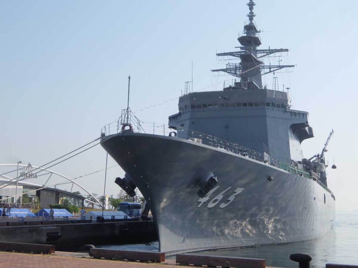 なんかどう見ても海自の艦艇っぽいのが見える。艦籍番号からすると掃海母艦「うらが」。
