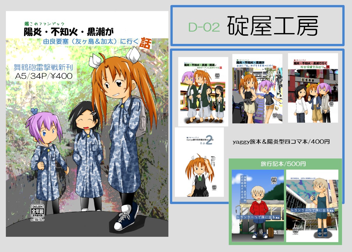 新刊「陽炎・不知火・黒潮が由良要塞(友ヶ島&加太)に行く話」他yaggyが彼方此方と出かける既刊他、陽炎型四コマ、後は冬コミと昨秋コミティアの新刊なんかも頒布の予定としておりますので宜しくお願い致します。