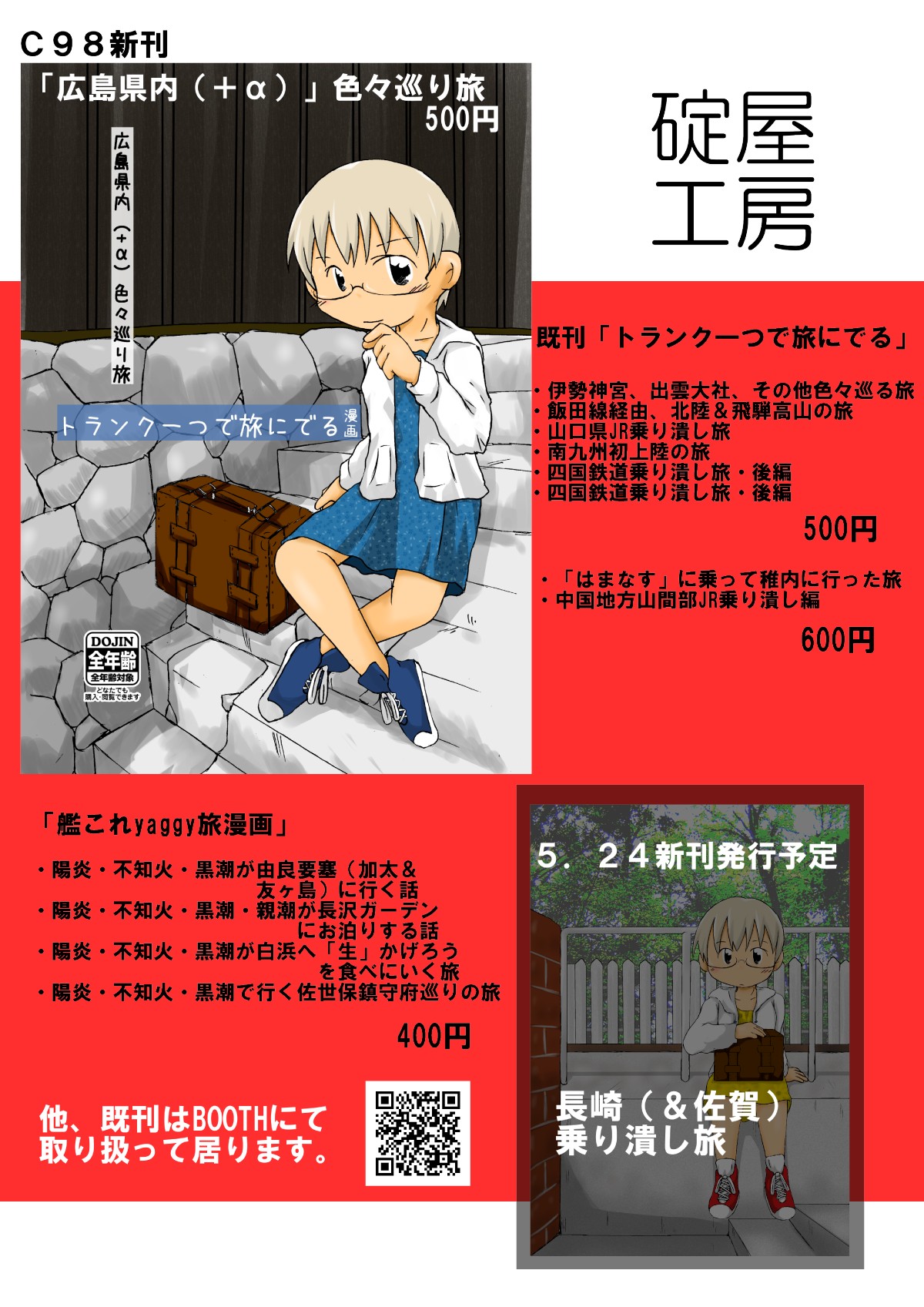 と、言う事で、C98新刊「トランク一つで旅にでる 広島県内(+α)色々巡り旅」は頒価500円となっております。尚、5月24日にも新刊頒布予定ですので、そちらに併せてのご購入もご検討頂ければ幸いです。
