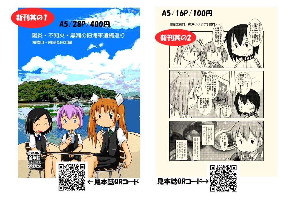 新刊は「陽炎・不知火・黒潮の旧海軍遺構巡り 和歌山・由良&白浜編(A5/28P/400円)」と「碇屋工房的、神戸いいところ案内(A5/16P/100円)」になります。今回のイベントは見本誌の代わりにHPにサンプルページを置いて居りますのでそちらをご覧ください。
