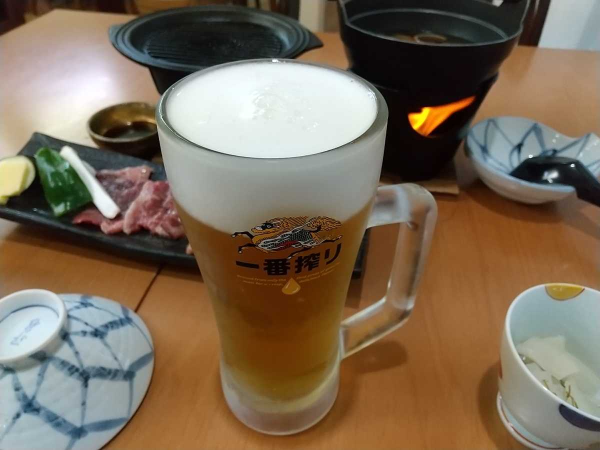 食事は一人焼肉にビールで乾杯。翌日に備えます(続く