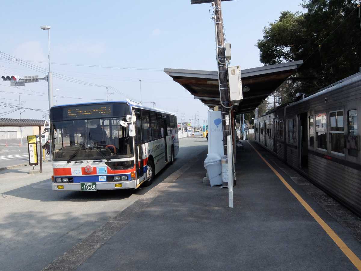 バスと電車が同一ホームで乗換可能な御代志駅。御代志駅も22年に南側にリニューアルして開設されるそうなので、この姿は見納め。