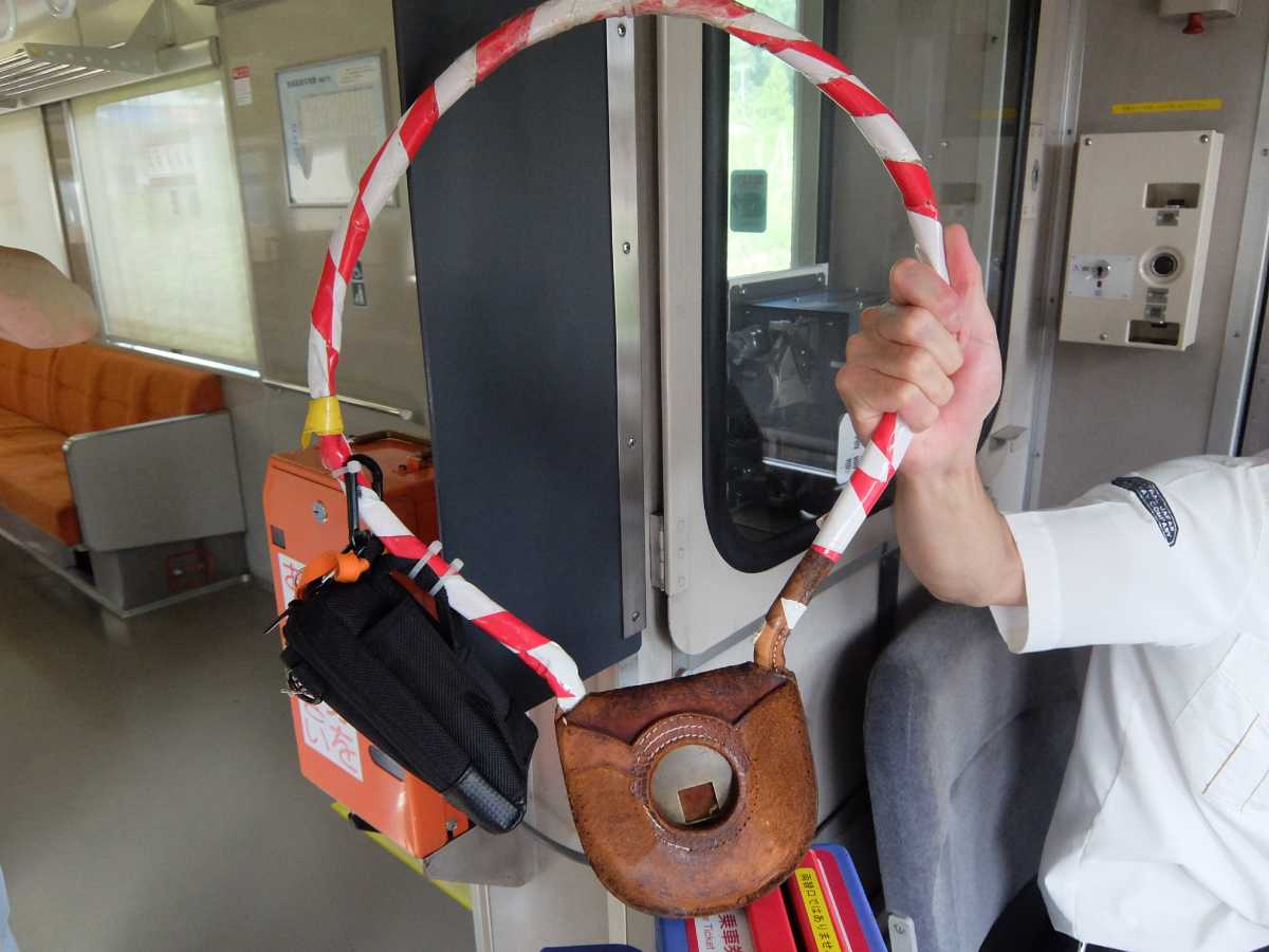 閉塞に用いられる「タブレット」はホルダー内にある穴の開いた円盤になります。この四角の穴あきが「伊勢奥津~家城」用