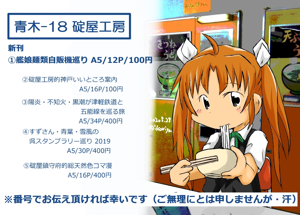 新刊は「艦娘麺類自販機巡り」(A5/12P/100円)になります