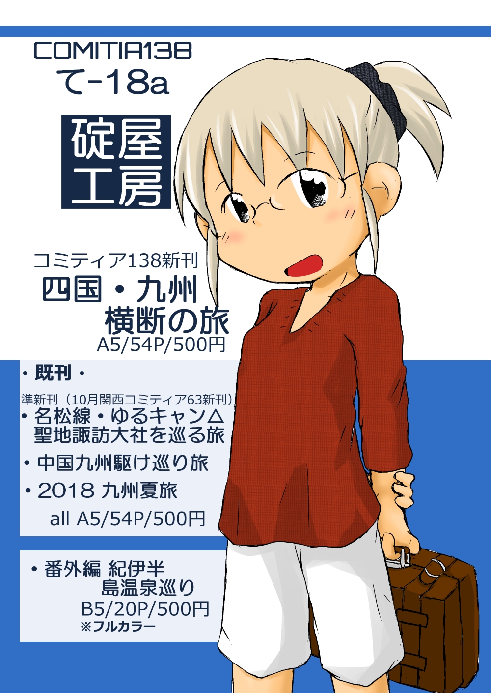 明日のコミティア138は「て-18a」 明日の関西コミティア62はE-05「碇屋工房」でお待ちしております。 新刊はこのBlogでも先週書いた通り「四国・九州横断の旅」となります。 今回も関西コミティアに引き続き、昨年秋以降の既刊のみに持ち込を絞らせて頂きまます。 お品書きにあるように 「名松線、ゆるキャン聖地、諏訪大社を巡る旅」 「四国九州駆け巡り旅」 「2018九州夏旅」 「番外編 紀伊半島温泉巡り」 それぞれ各500円のみの頒布となりますのでご了承下さい。 その他既刊は、BOOTHや各種書店委託(メロンブックス・とらのあな)をご利用いただければ幸いです。 投稿者: ikariya 明日、いかりや。 93~03年まで成人向け漫画雑誌「漫画ホットミルク」「漫画ばんがいち」「コミックメガキューブ」の読者コーナーに投稿していた元・ハガキ投稿者。漫画ホットミルク読者集会「愛宴」の幹事も長らく務めておりました…...まだ「おります」かもしれません。同人活動も碇屋工房にて97年~現在まで続いております。好きなものに関してはこちら参照で。 ikariya のすべての投稿を表示