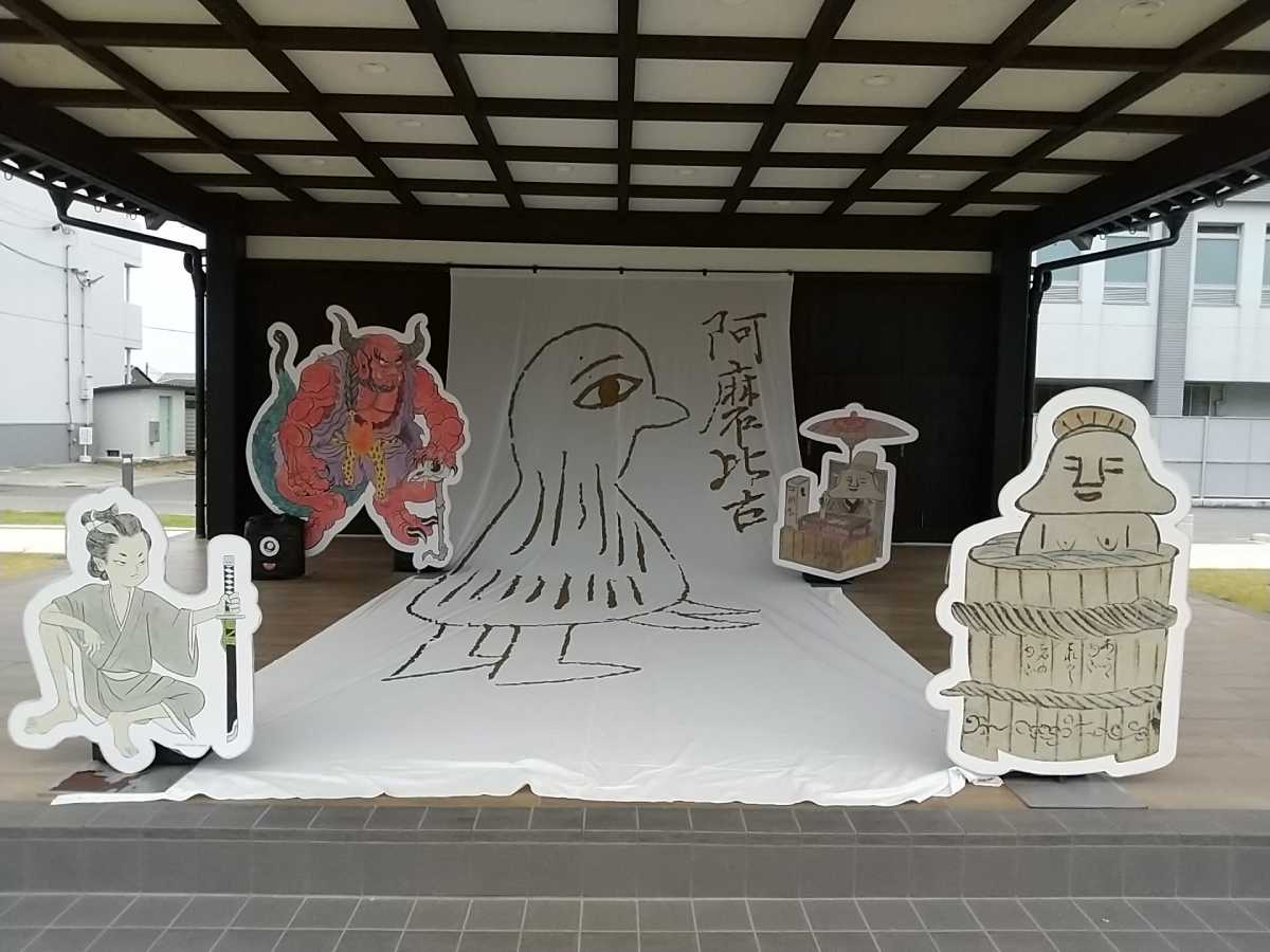 アマビコの垂れ幕の下がっていた「三次もののけミュージアム」のステージ