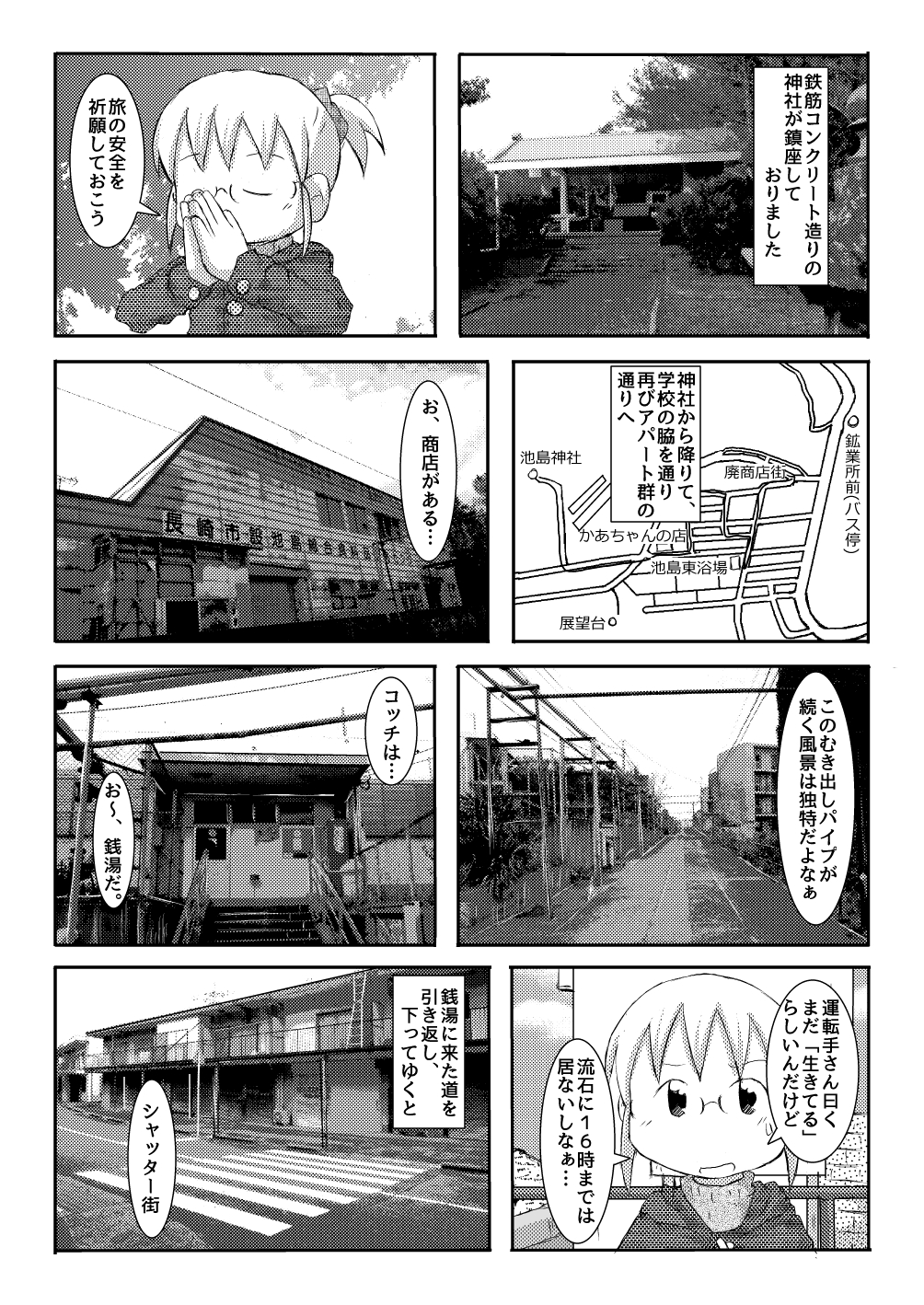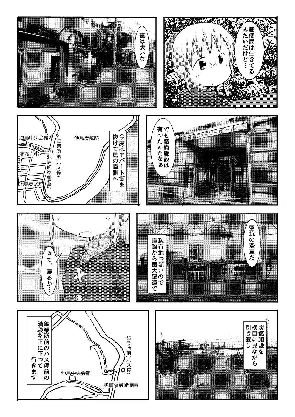 【漫画版】2020、九州冬旅 05 神社下から登って池島神社に参拝後、アパート群の合間を彷徨いながら島の東側へ。更に引き返し、鉱業所前バス停前の階段を降りて行きます。 前回←→次回 池島神社 池島アパート群の街並み(写真はHP、若しくはGooglephotoにUPしています) 投稿者: ikariya 明日、いかりや。 93~03年まで成人向け漫画雑誌「漫画ホットミルク」「漫画ばんがいち」「コミックメガキューブ」の読者コーナーに投稿していた元・ハガキ投稿者。漫画ホットミルク読者集会「愛宴」の幹事も長らく務めておりました…...まだ「おります」かもしれません。同人活動も碇屋工房にて97年~現在まで続いております。好きなものに関してはこちら参照で。 ikariya のすべての投稿を表示