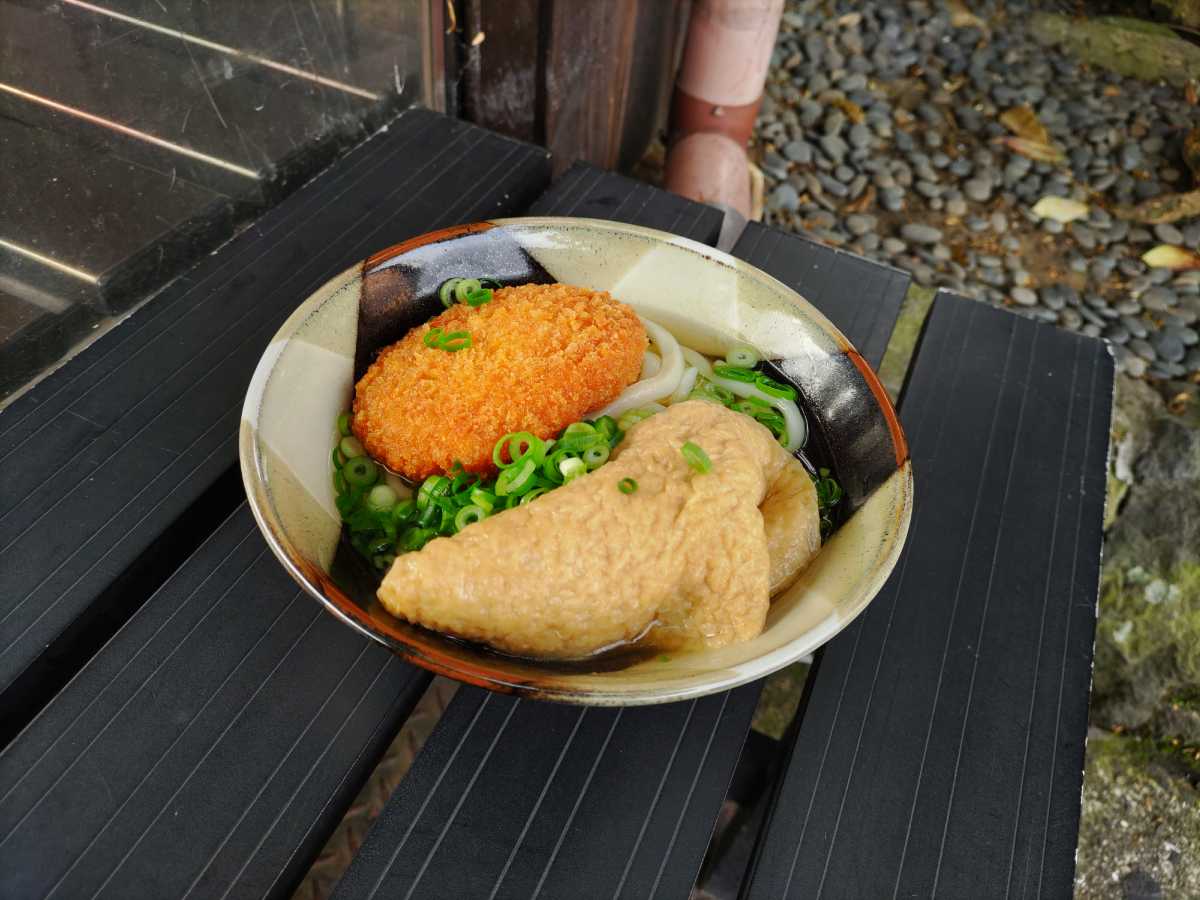 10数分並んでうどんをget。今回は小(1玉)熱+揚げ+コロッケを温かい出汁で420円。やっぱ「がもう」来たらこのデカい揚げが欲しい所。当然、安定の美味しさです♪