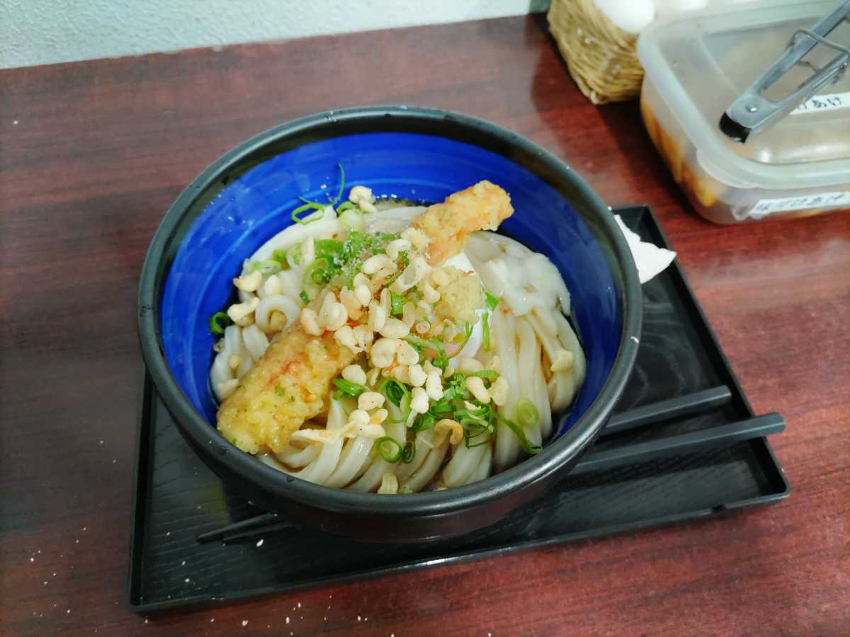日の出製麵所では中(1.5玉)ひや+ちくわ天+温泉卵に冷出汁+天かすで350円。此処のうどんはマジで小麦粉薫んですよね…こしは其処まで強くないけと十分。やっぱ美味いわ、此処。